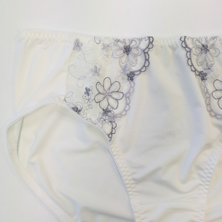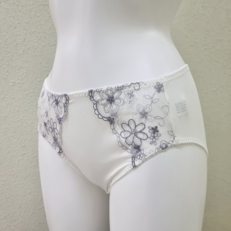 線画調の丸花モチーフの刺しゅうをグレーの濃淡で大人っぽく仕上げました。