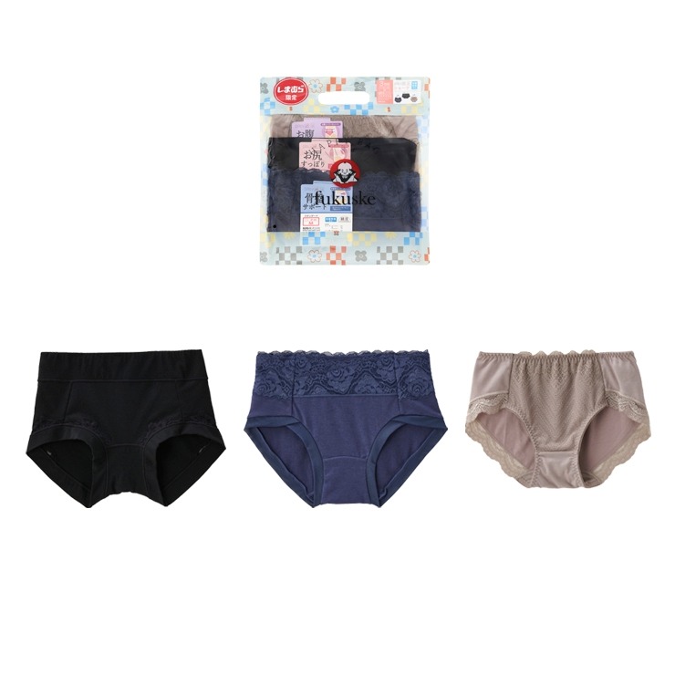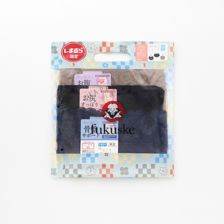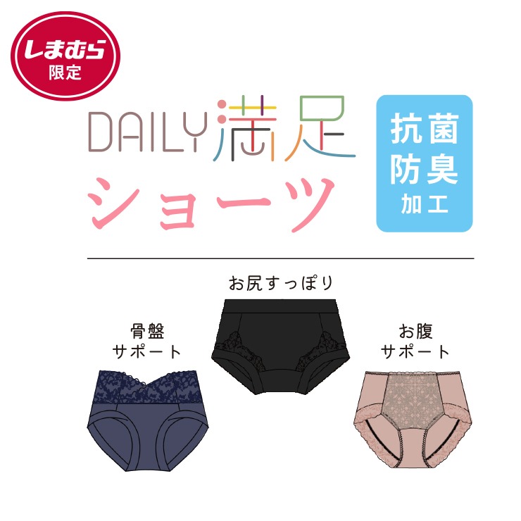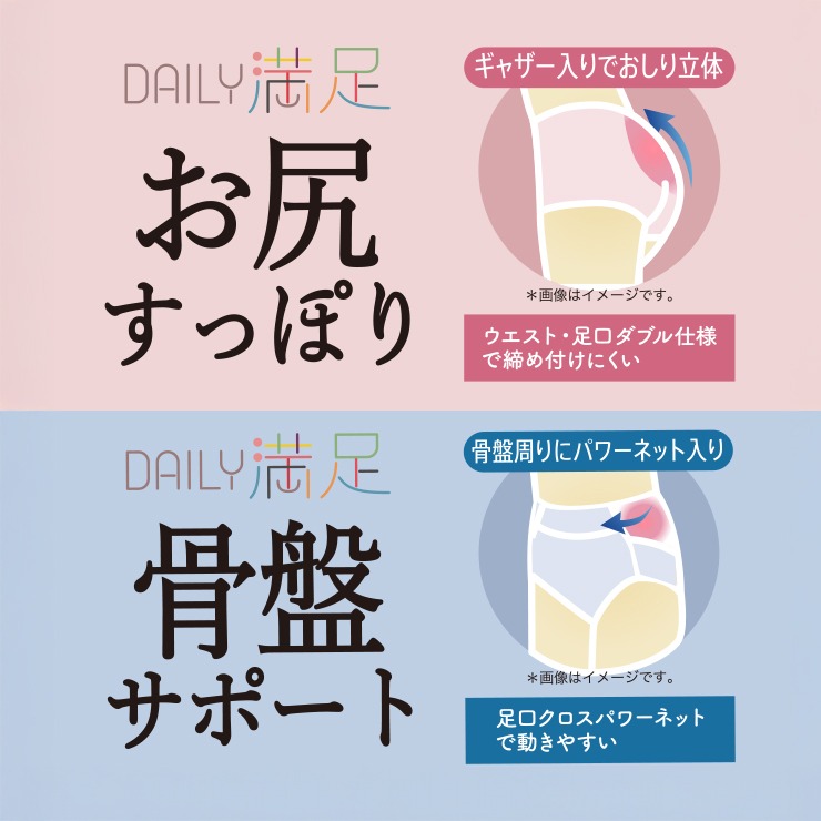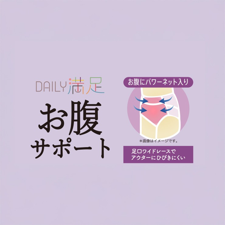 DAILY満足の3枚組のショーツ。ウエスト・足口ダブル仕様で締め付けにくいお尻すっぽりタイプ。骨盤周りにパワーネット入りで、足口もクロスパワーネットで動きやすい骨盤サポートタイプ。お腹にパワーネット入りで、足口ワイドレースでアウターにひびきにくいお腹サポートタイプ。何枚あってもうれしいショーツのセット。