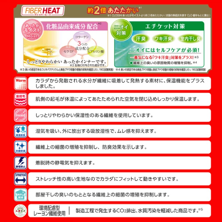 CLOSSHI あったかモイストより約2倍のあたたかさに3つの化粧品由来成分を配合したしっとり潤いのある素材です。
