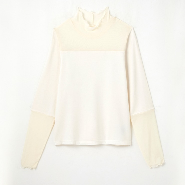 ③シアー×裏起毛切替長袖シャツ…さりげない透け感で女性らしさが高まるシアーインナー。着るだけでエレガントな存在。裏起毛なので肌寒い春先まで使えます。