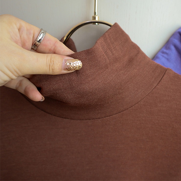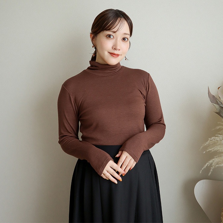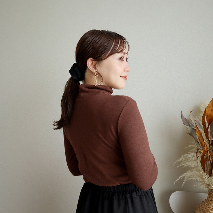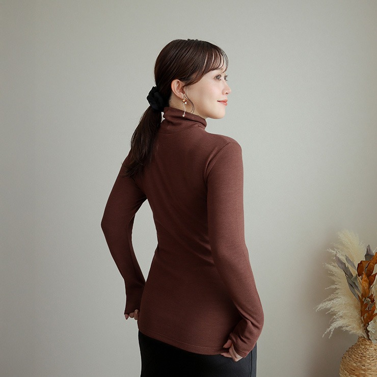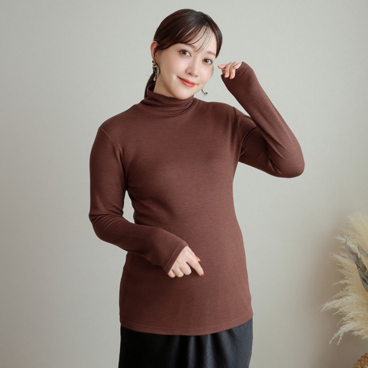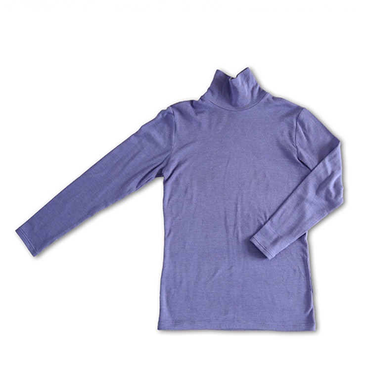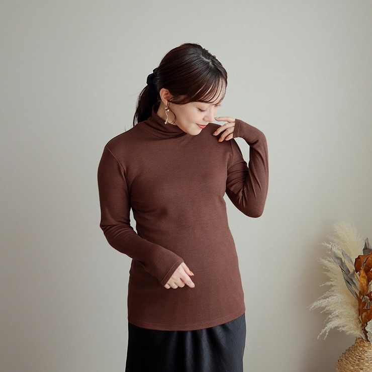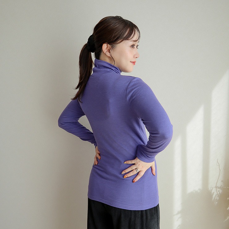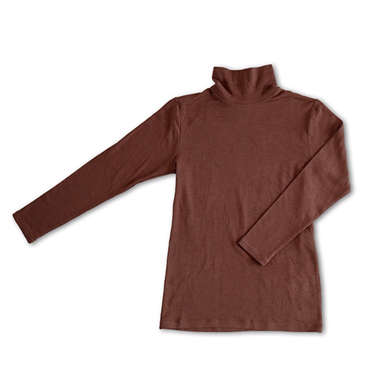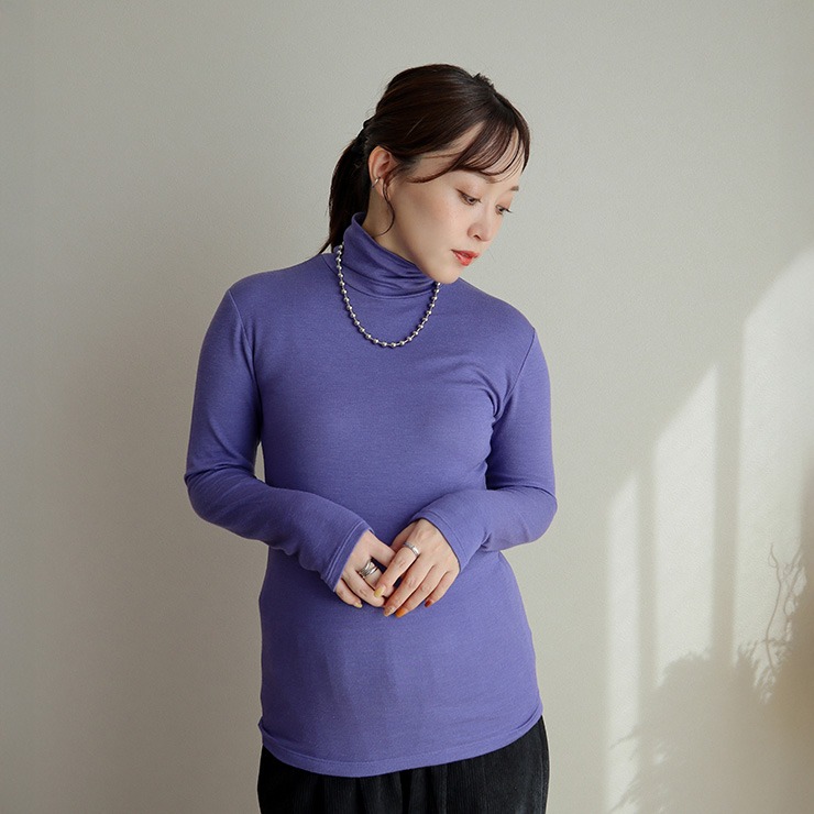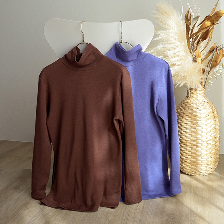 肌側に綿100%の素材を使用、外時間の多い日や真冬の寒い日におすすめ。首元までしっかりあたたかいタートルネック型です