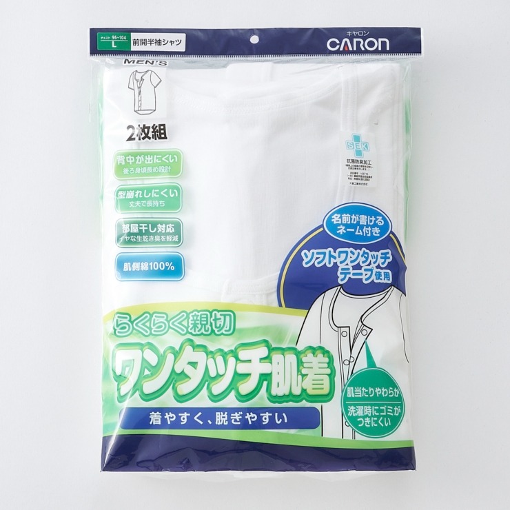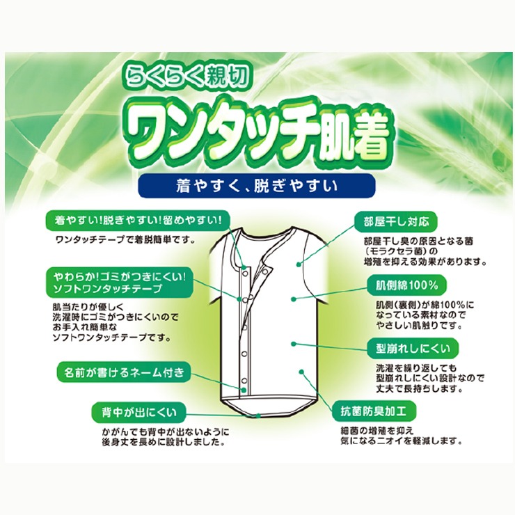 使用しているソフトワンタッチテープは肌当たりが優しく、洗濯時にゴミも付きにくいのでお手入れも簡単な、着やすく、脱ぎやすい肌着です。