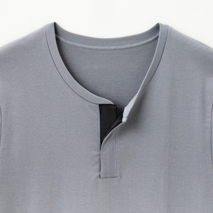 首元が開くヘンリーネック仕様で、大きく開く。