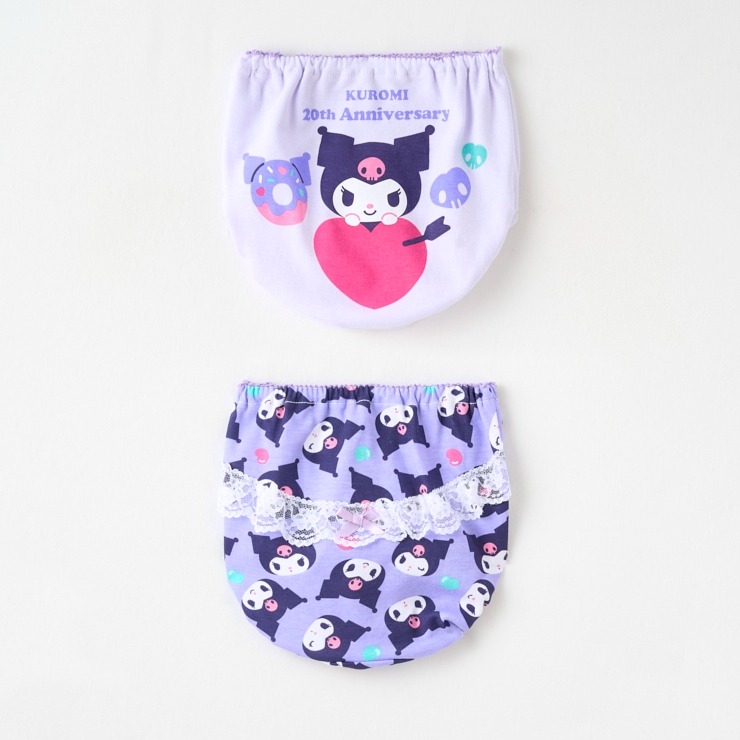 大人気 サンリオキャラクターズより クロミ2枚組ショーツが登場。 クロミ20周年アートのワンポイントプリントしたショーツと総柄ショーツにレースをつけた2枚組ショーツです。