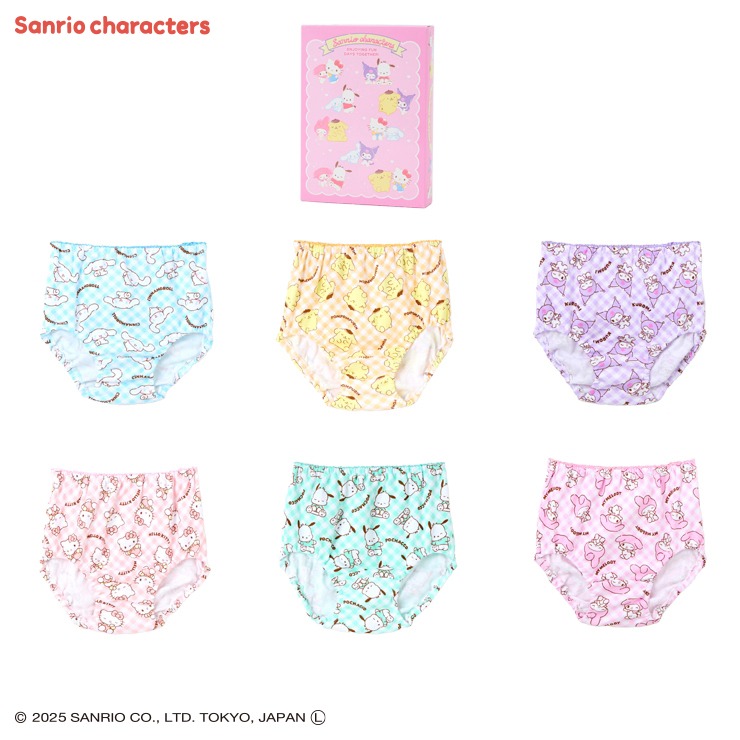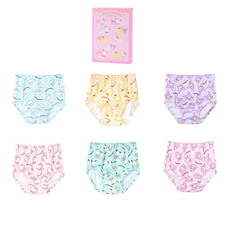 大人気 サンリオキャラクターズより サンリオキャラクターズ6枚組ショーツの登場。 サンリオキャラクターズ ポムポムプリン・シナモロール・ポチャッコ・クロミ・ハローキティ・マイメロディ 総柄ショーツ6枚組セットです。