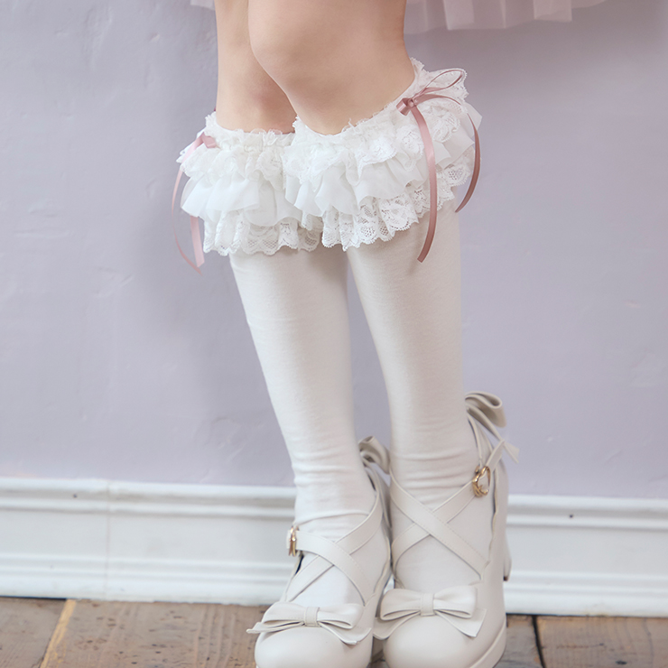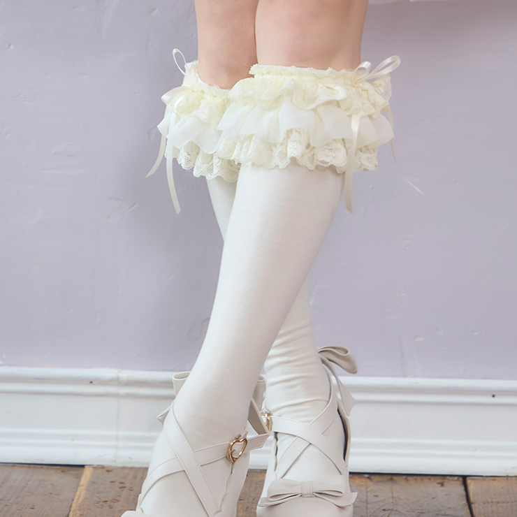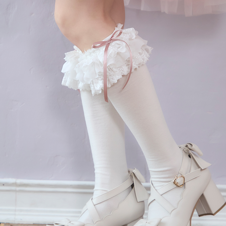 フリル感にこだわった3段レースにリボンモチーフが付いているハイソックスです◎