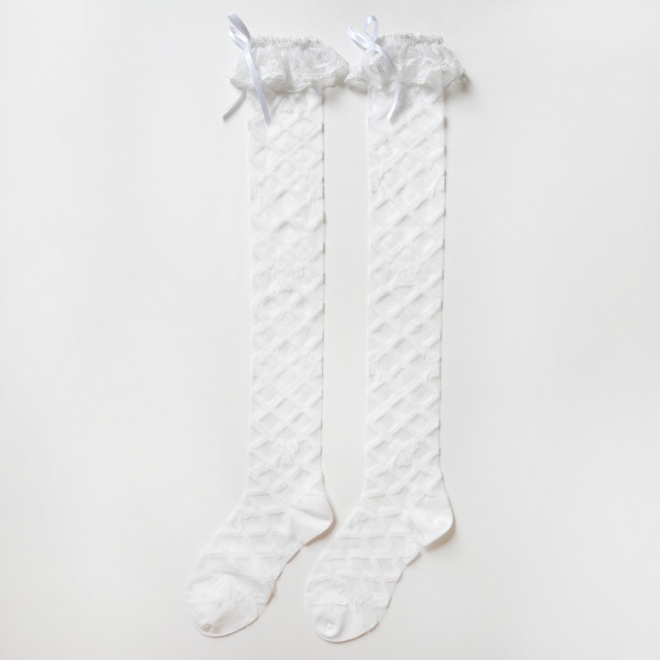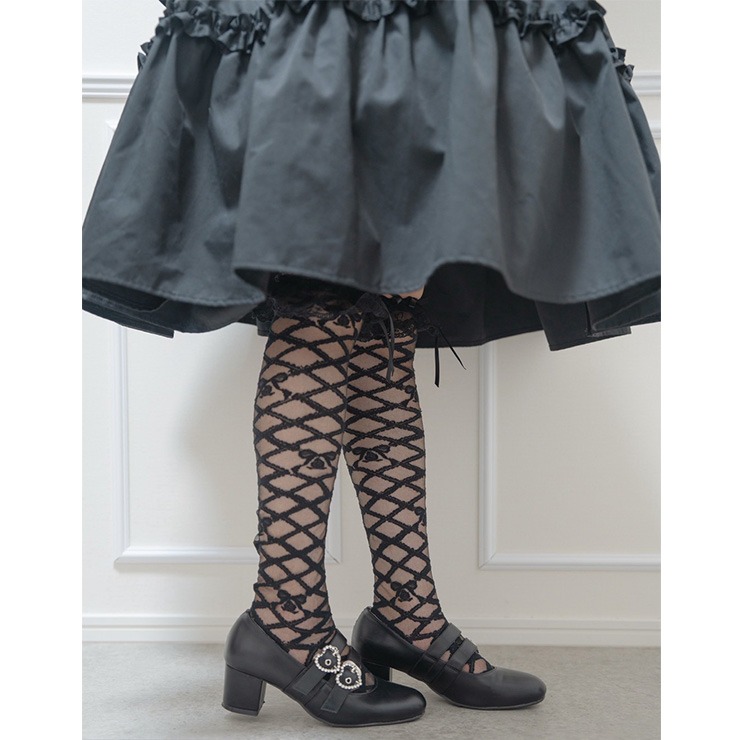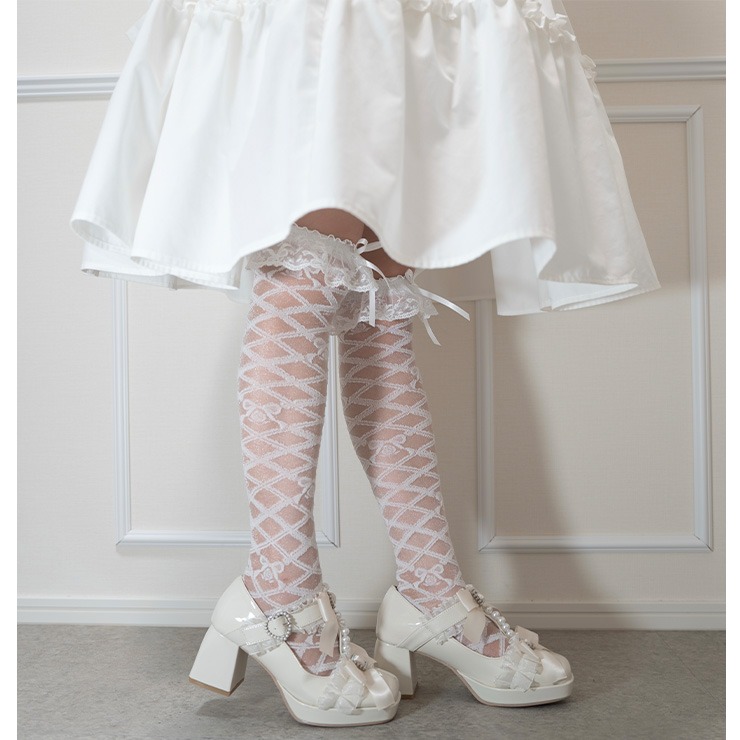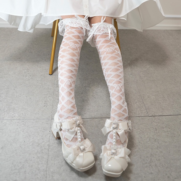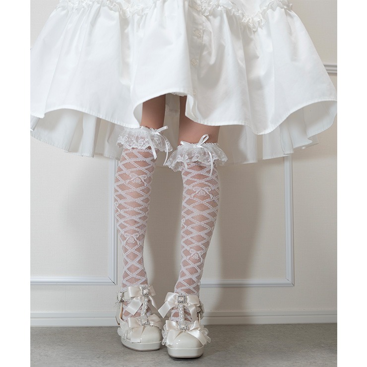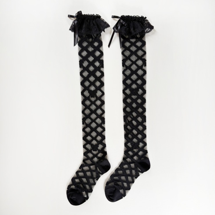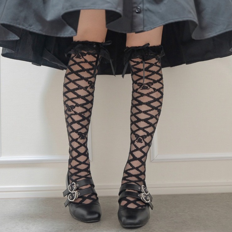 レースアップデザインのシアー素材の靴下に、履き口のレースとリボンモチーフが特徴のオーバーニーソックスです◎