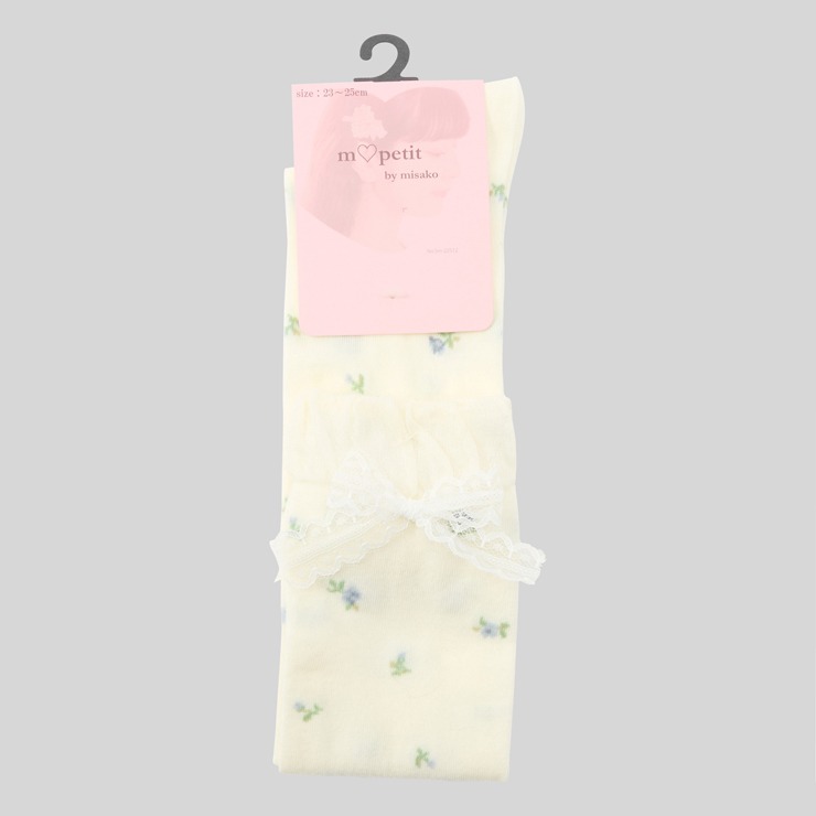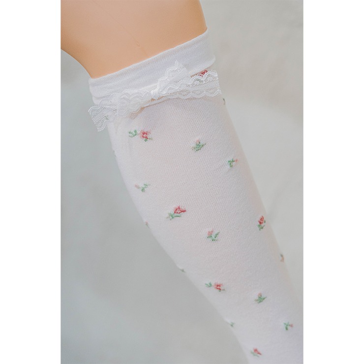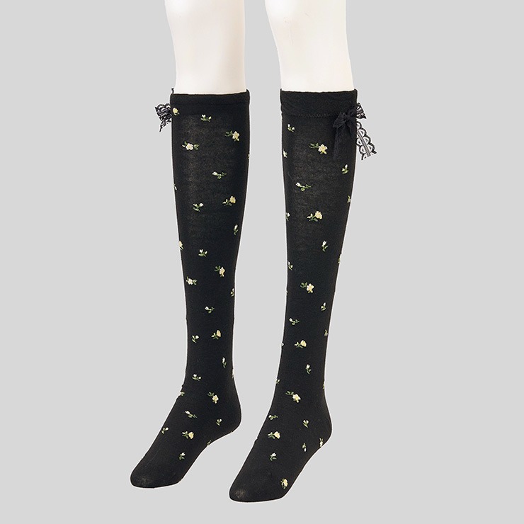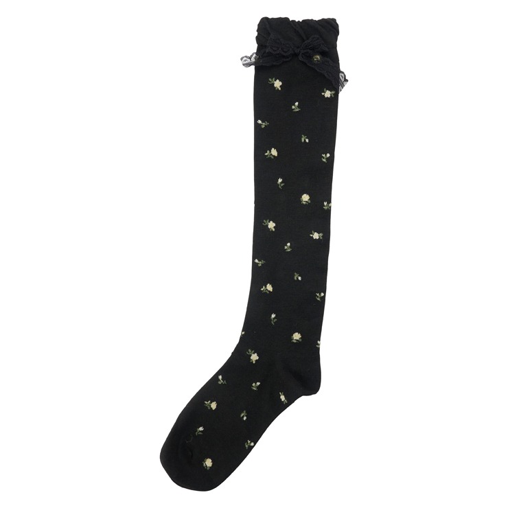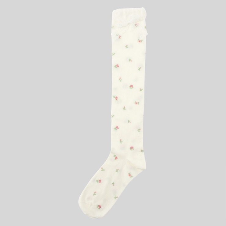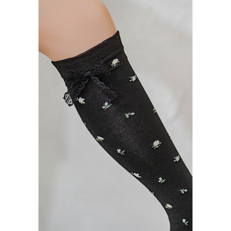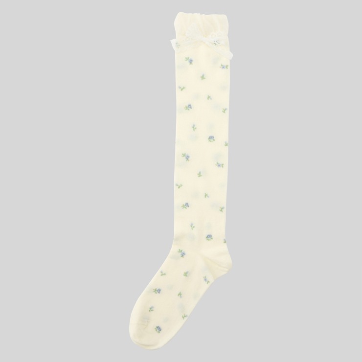 全体に散らばっている花柄デザインに、レース素材のリボンモチーフが特徴のハイソックスです◎