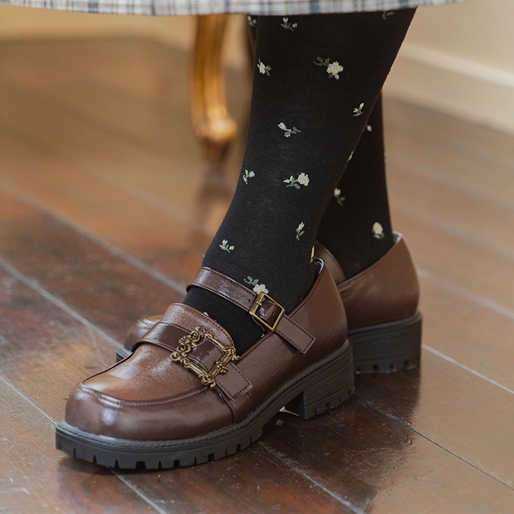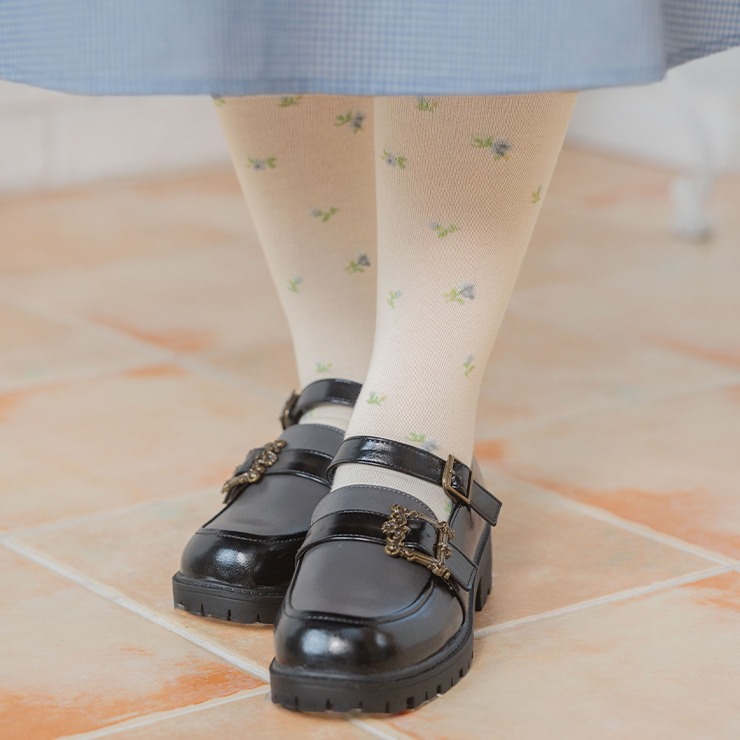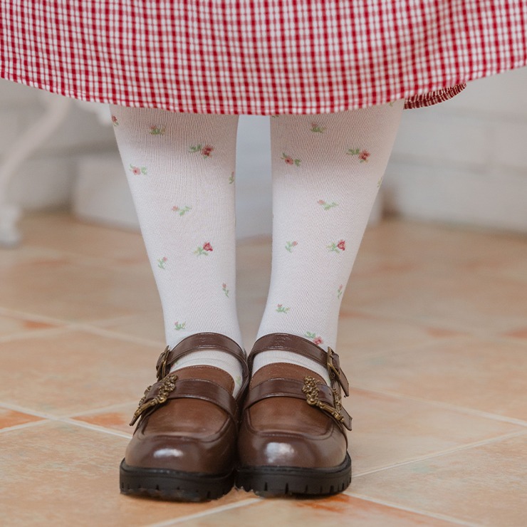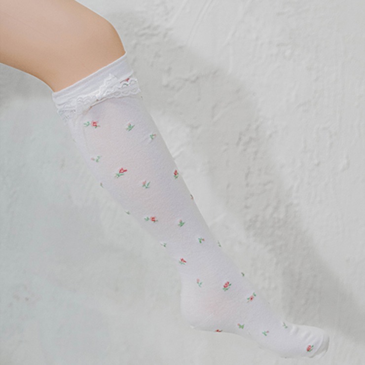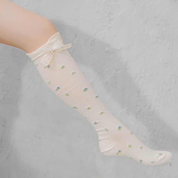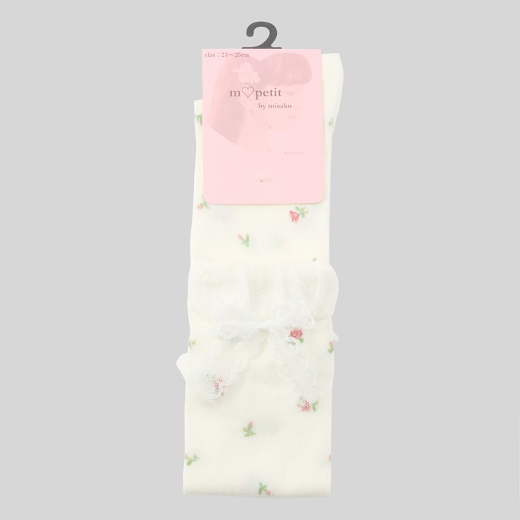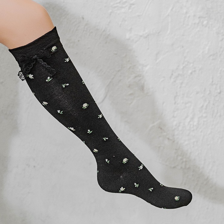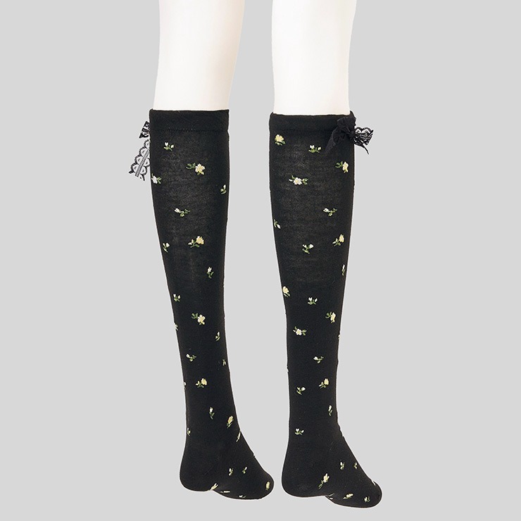 全体に散らばっている花柄デザインに、レース素材のリボンモチーフが特徴のハイソックスです◎
