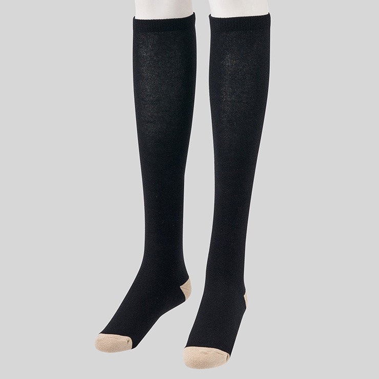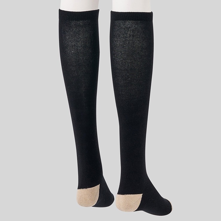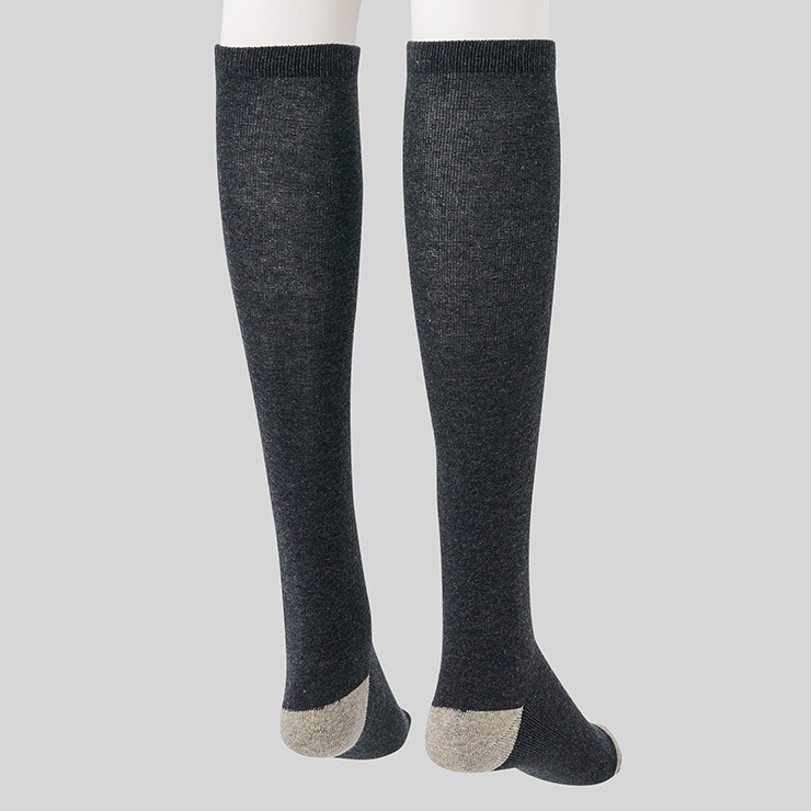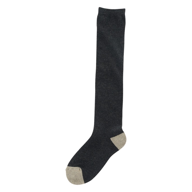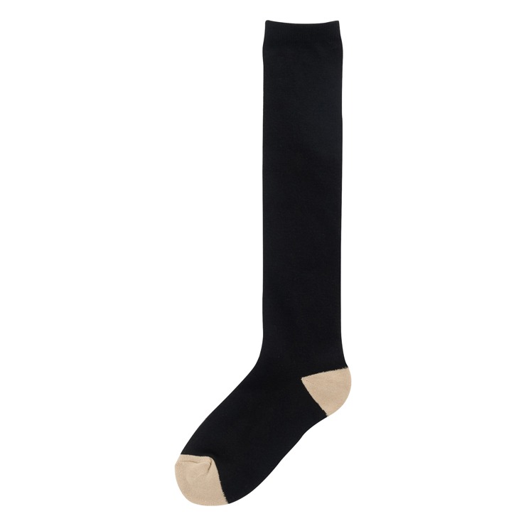 シンプルなベース無地デザインにつま先と踵の配色が切り替わっているデザインのハイソックスです。