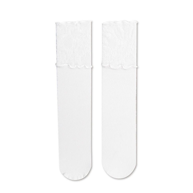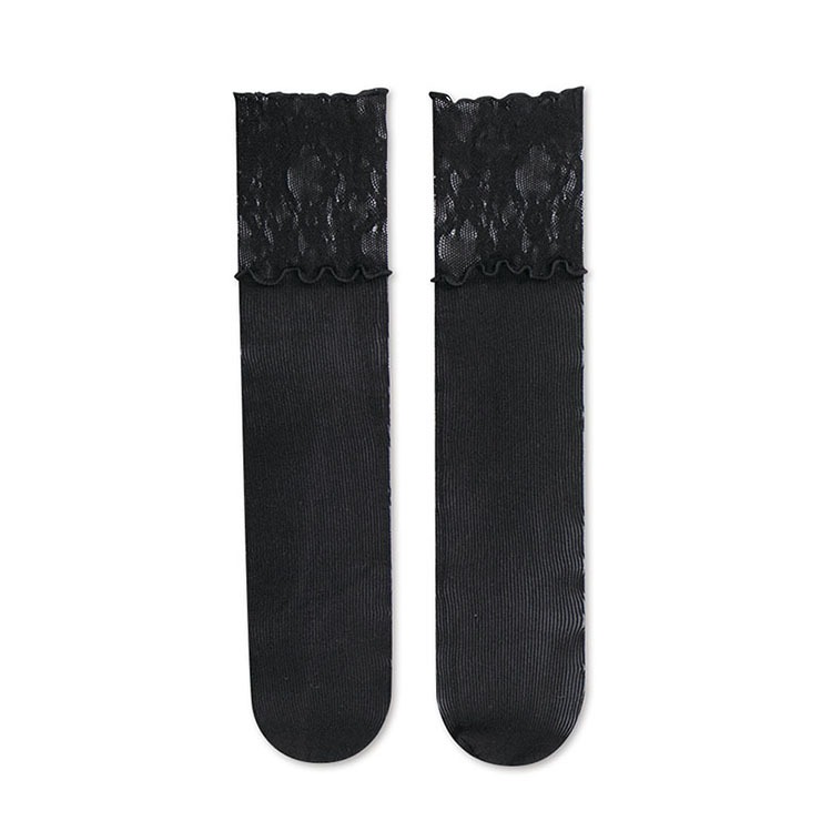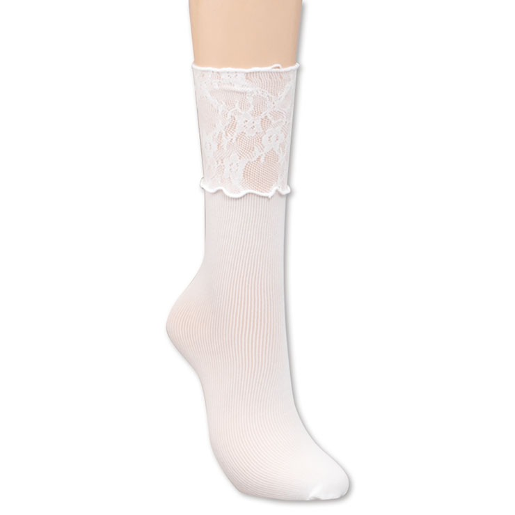 リブ編みデザイン靴下の履き口が花柄レースに切り替えられているクルーソックスです◎