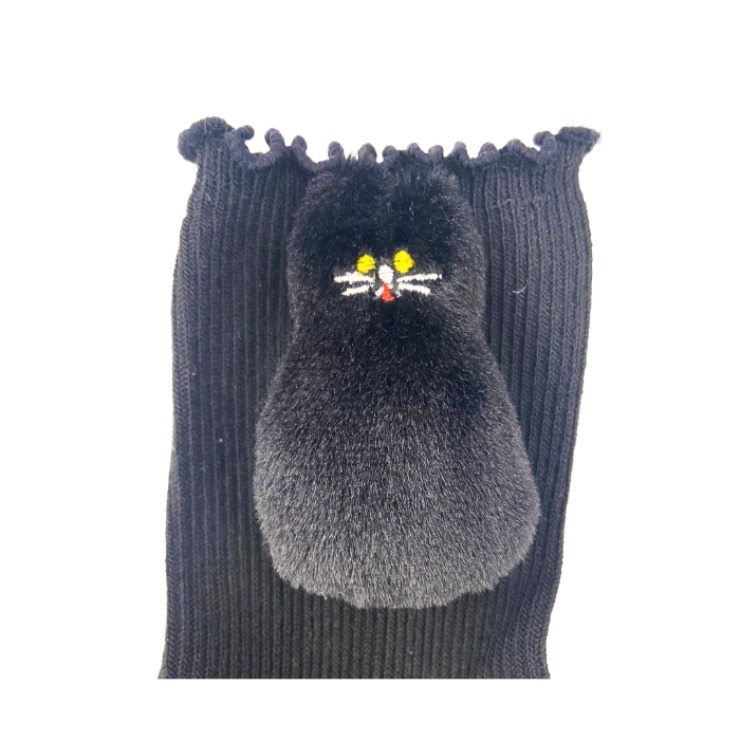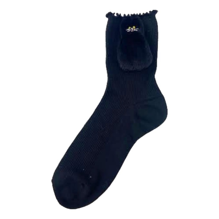 レディース クルーソックス マスコット付(23-25cm・ねこ) ブラック 213 ブラック 213