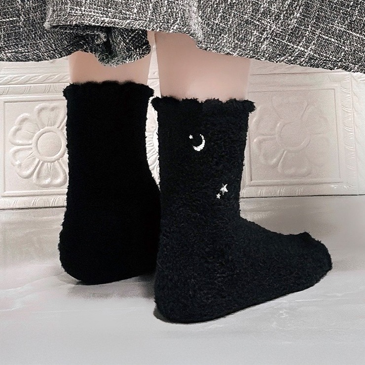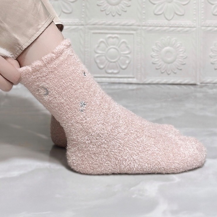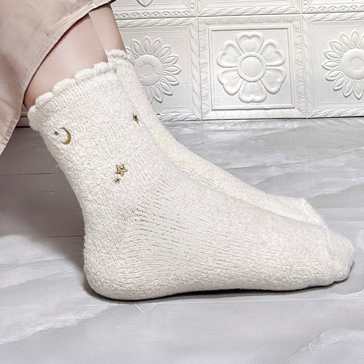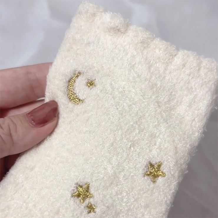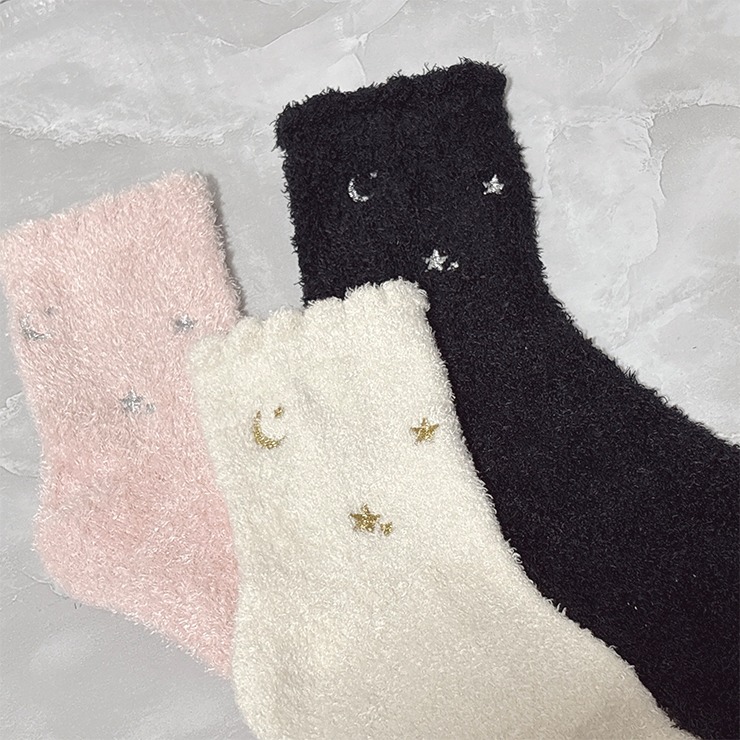 フワフワのモール素材の靴下に、星と月の刺繍デザインが特徴のクルーソックスです◎