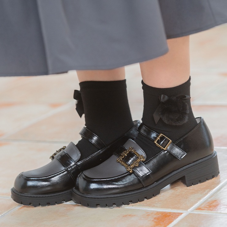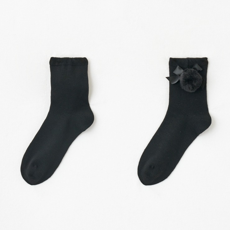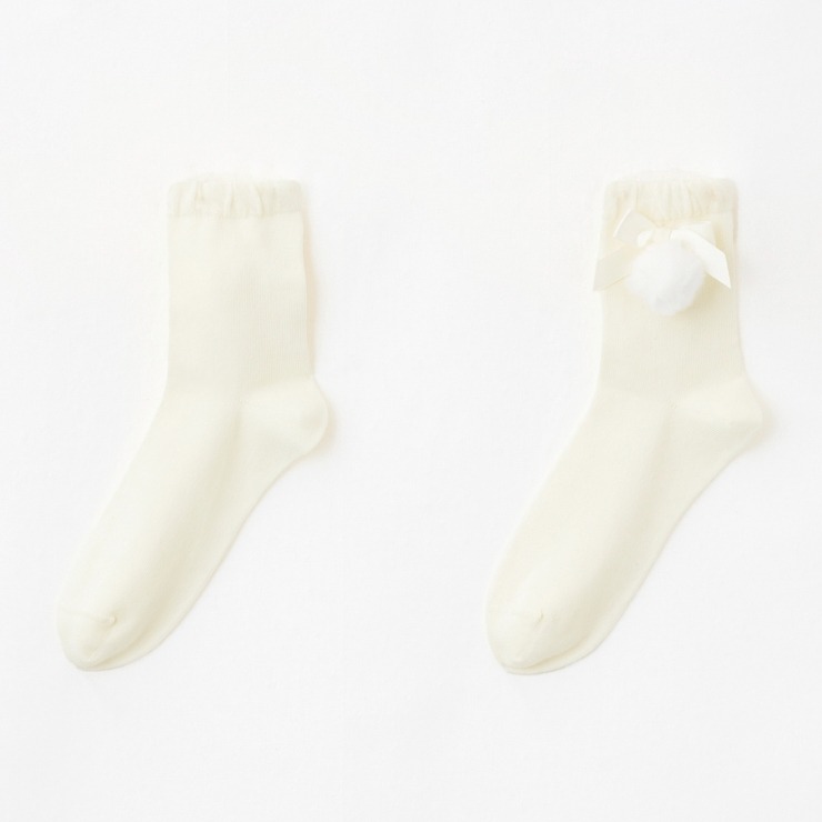 フェイクファー素材のポンポンとリボンモチーフが特徴のクルーソックスです◎