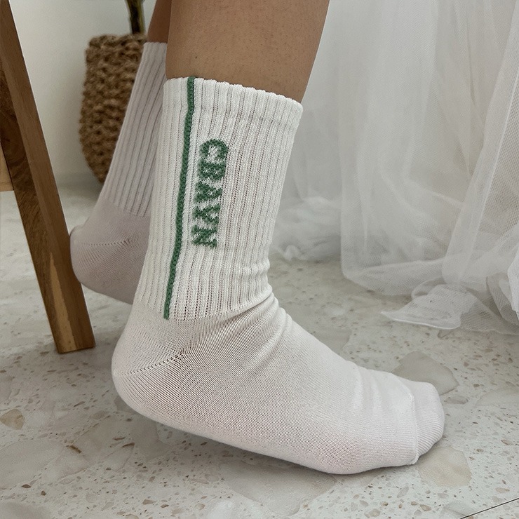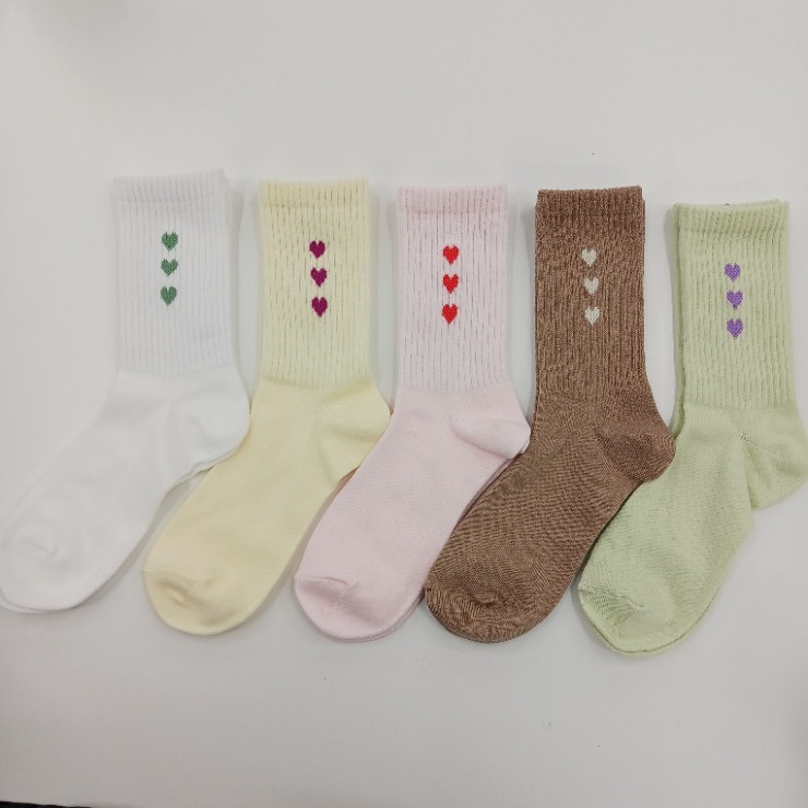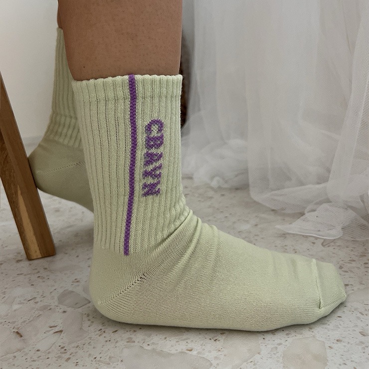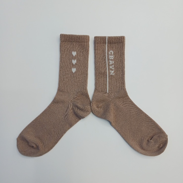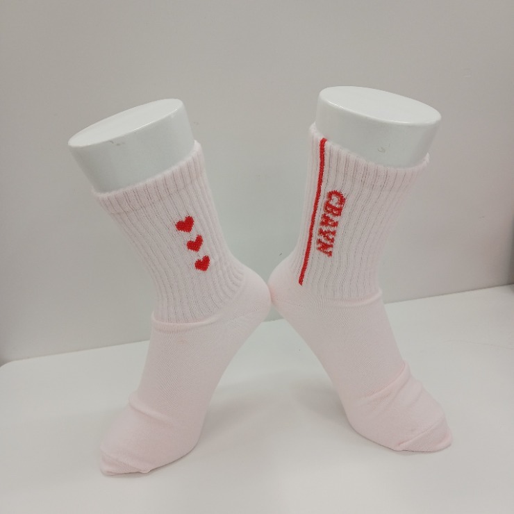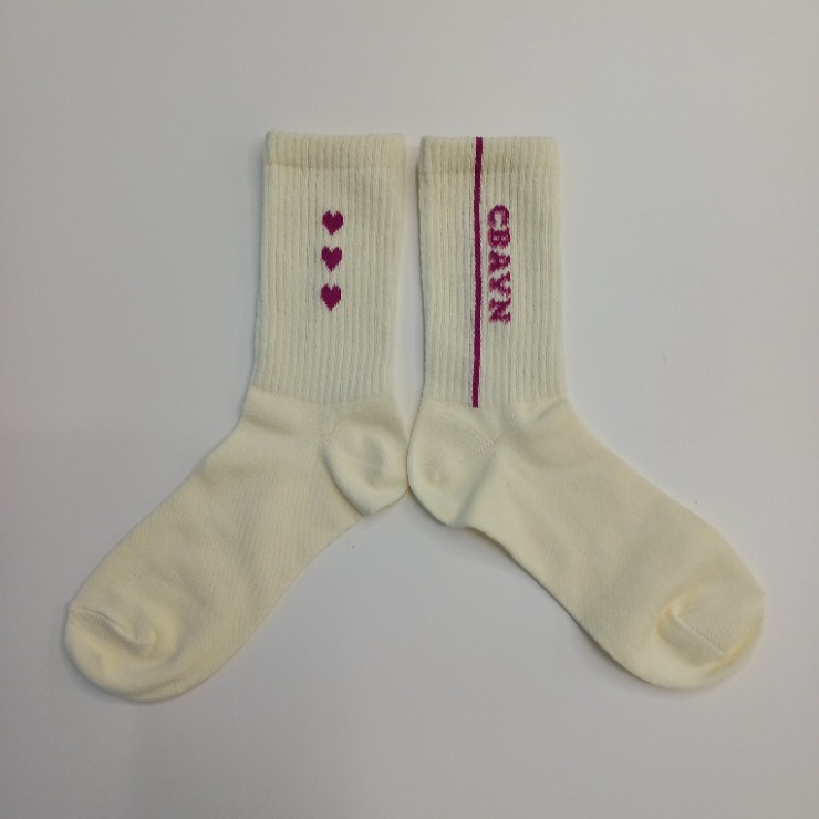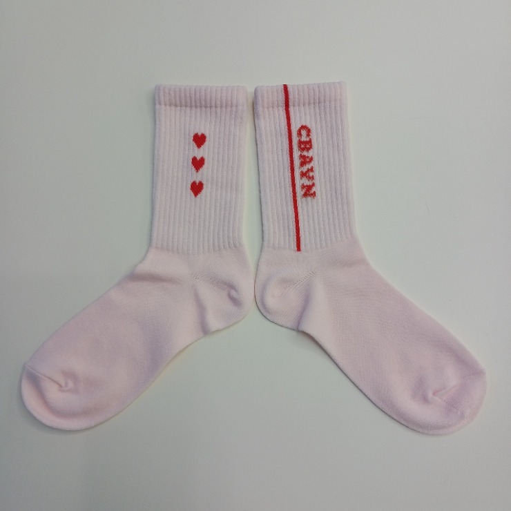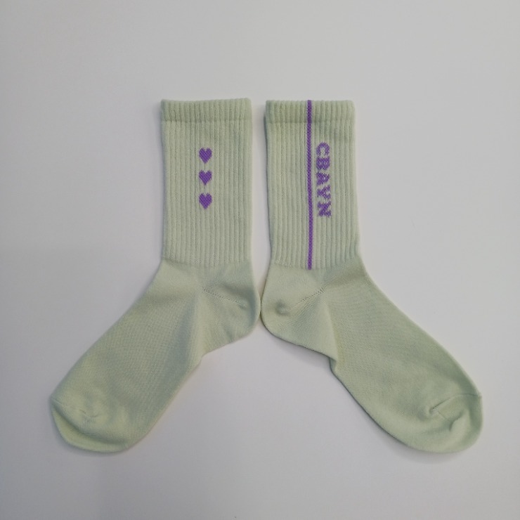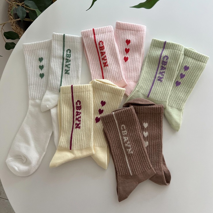 SNSでカラフルママファッションを発信しているインフルエンサー、ayanoさんとコラボした靴下が登場!ハートとロゴ、左右非対称の柄がポイントの靴下!