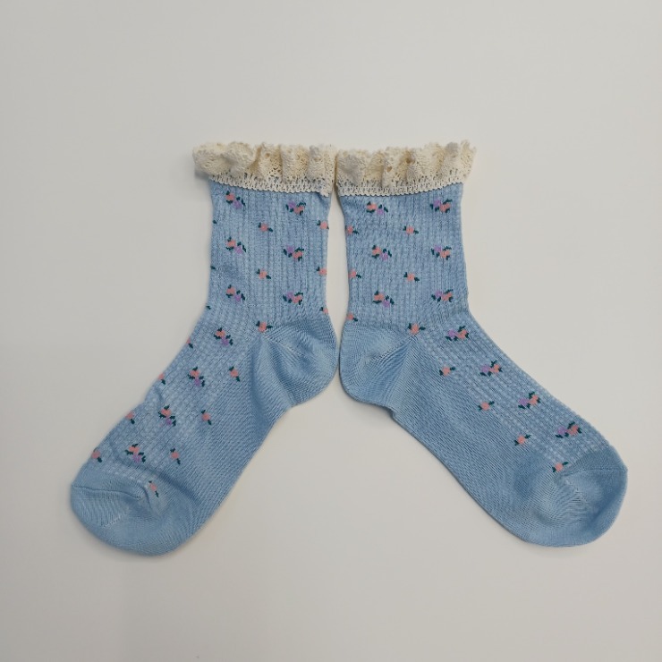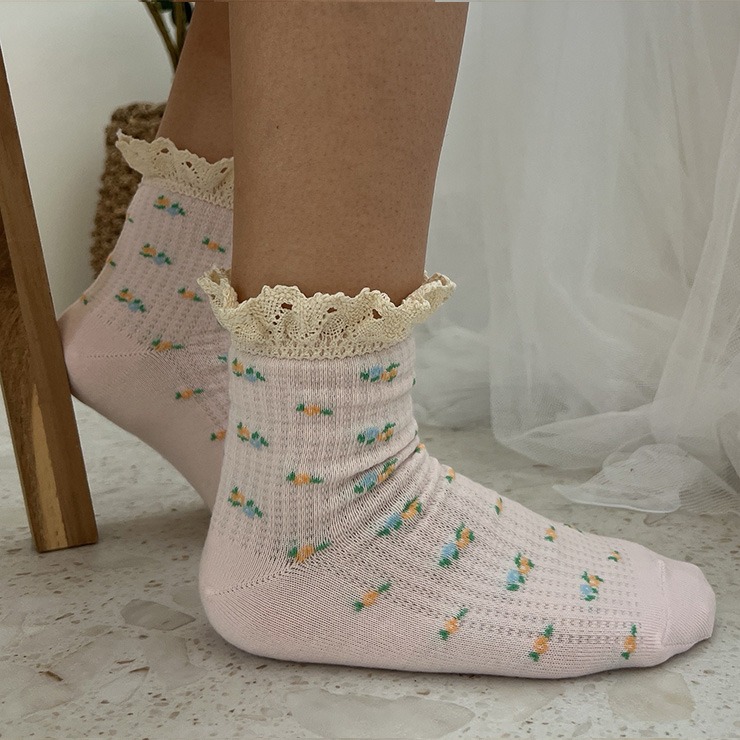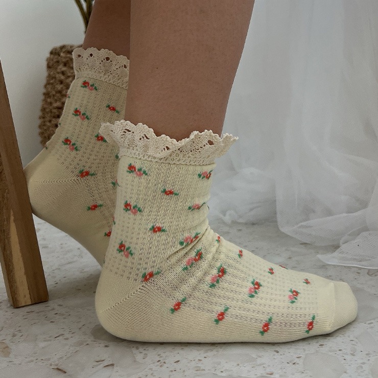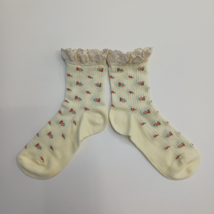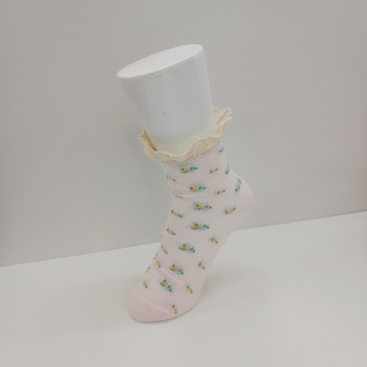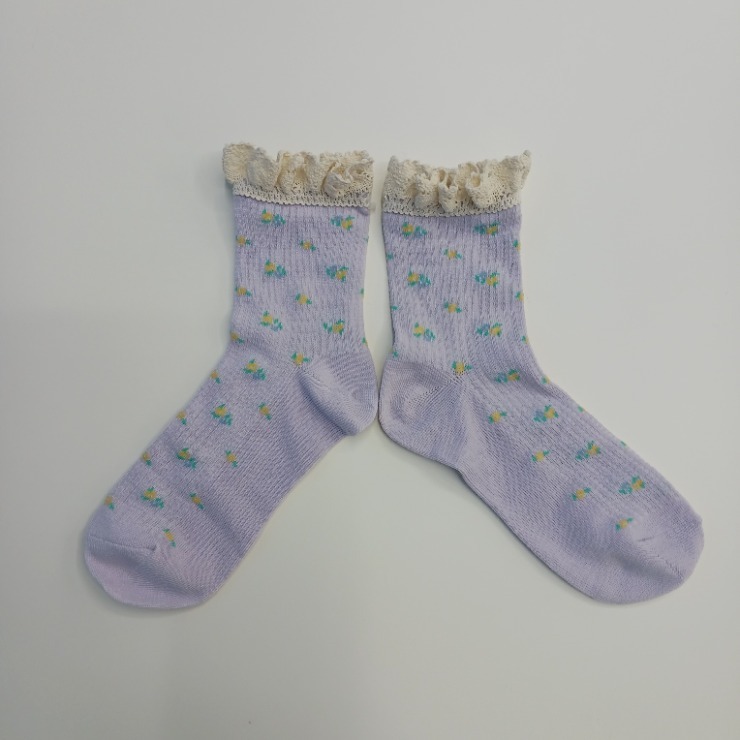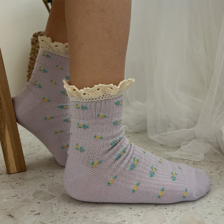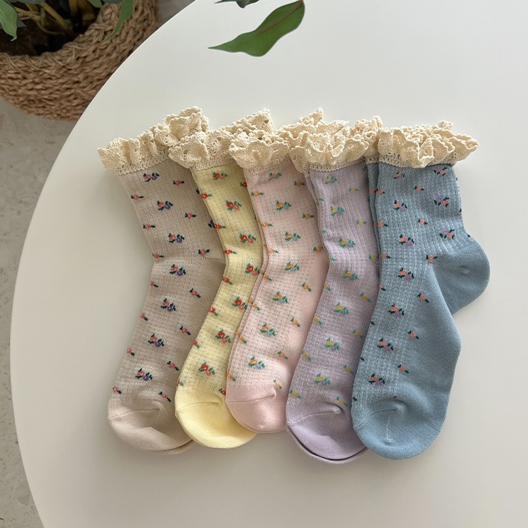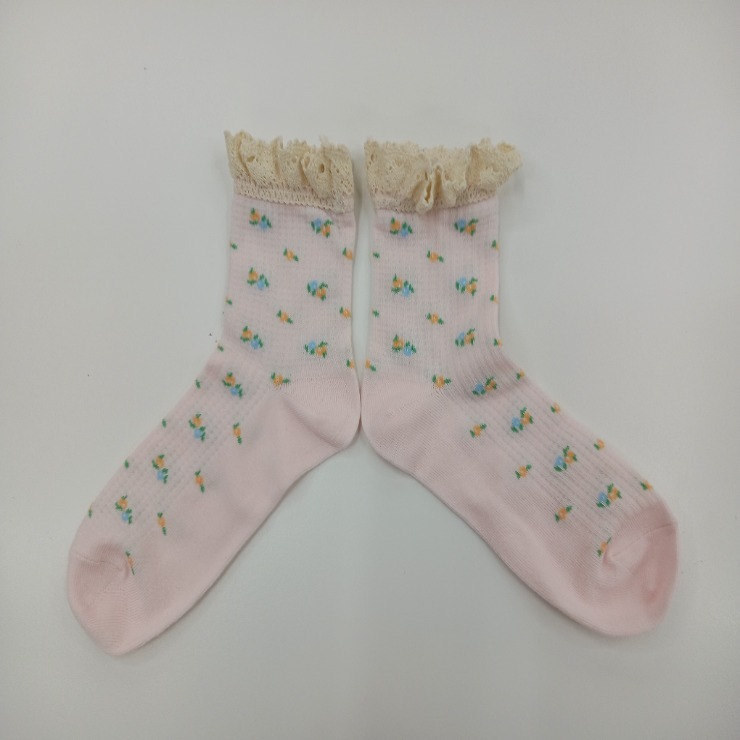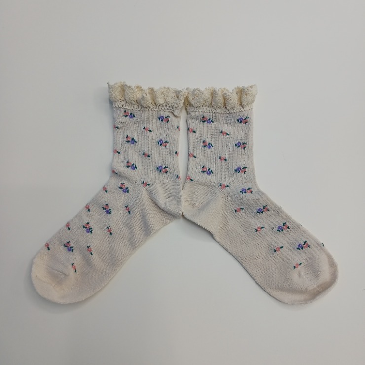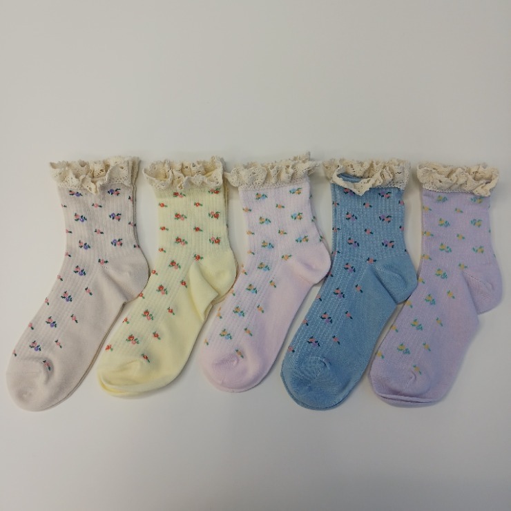 SNSでカラフルママファッションを発信しているインフルエンサー、ayanoさんとコラボした靴下が登場!履き口のコットンレースと小花柄が可愛い靴下!