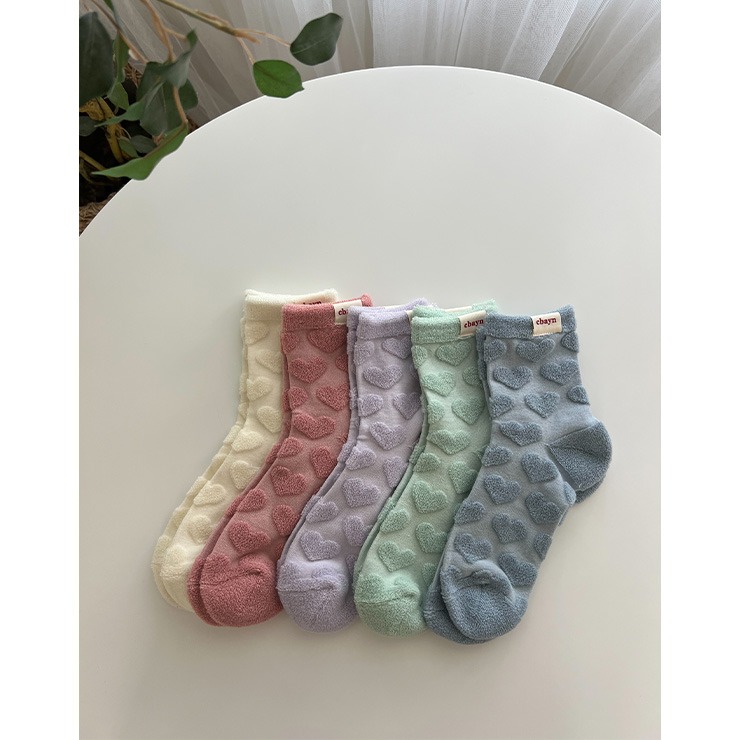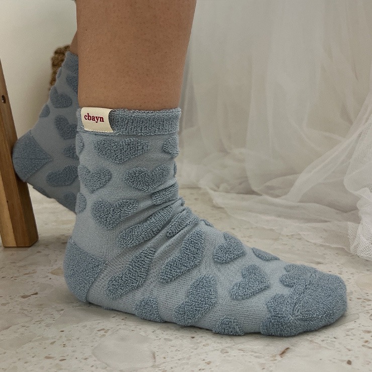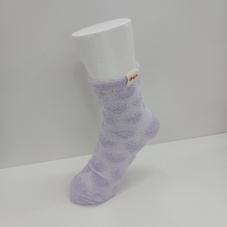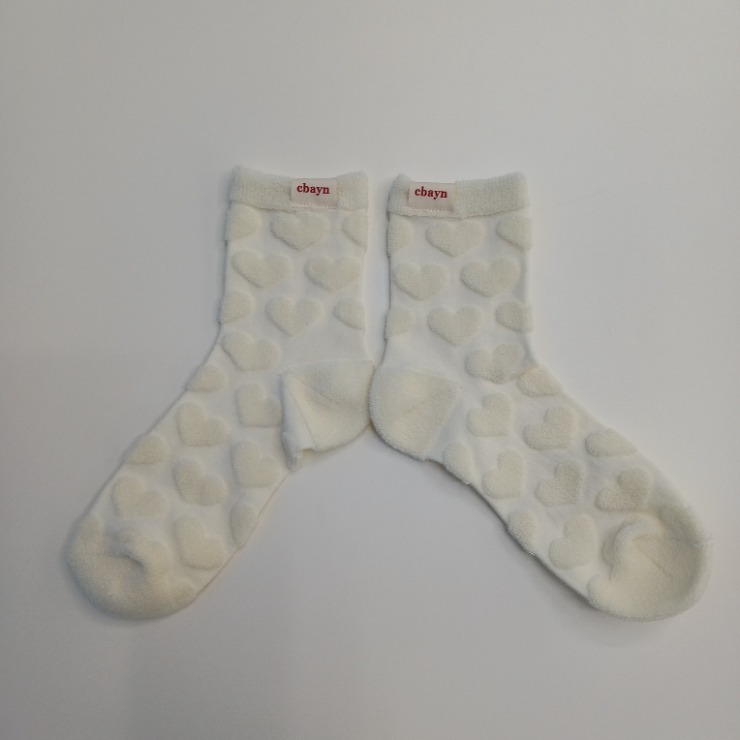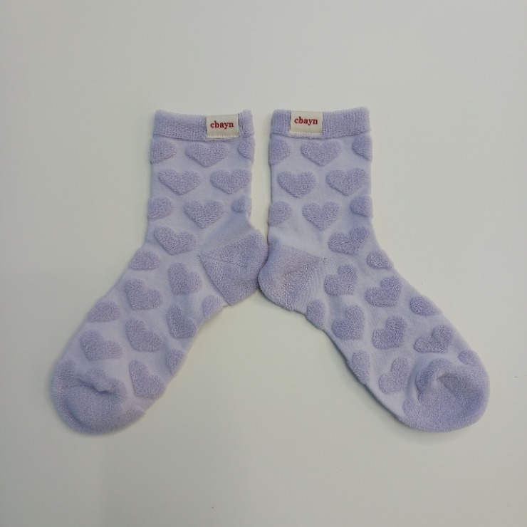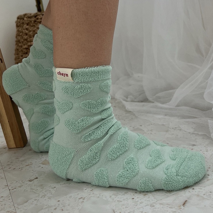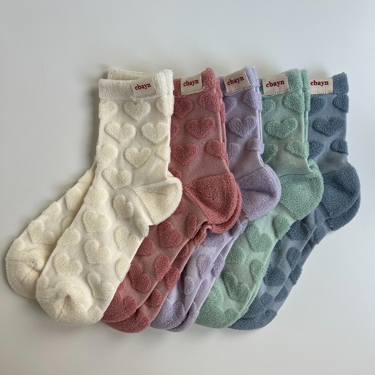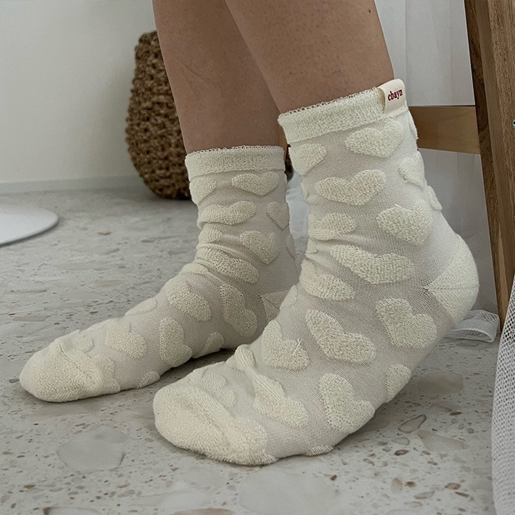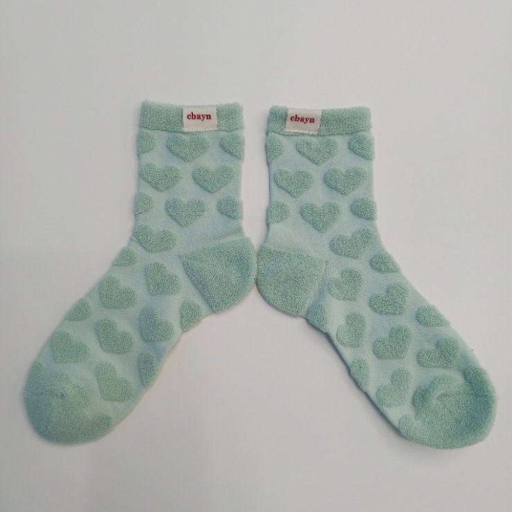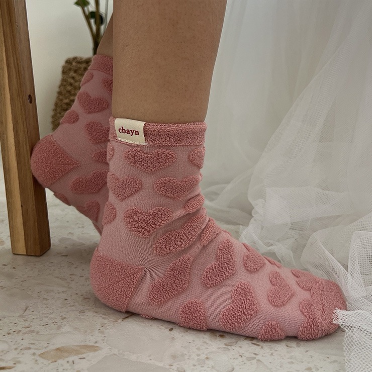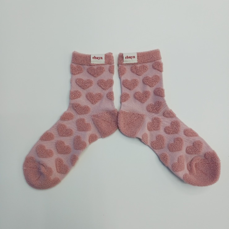 SNSでカラフルママファッションを発信しているインフルエンサー、ayanoさんとコラボした靴下が登場!ふわふわパイル地のハートと、履き口のネームがポイントの靴下!