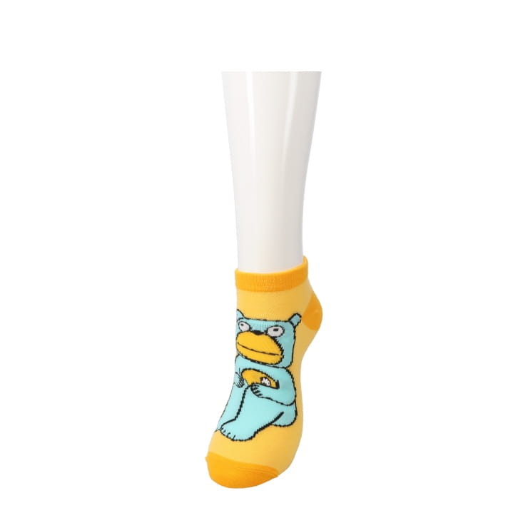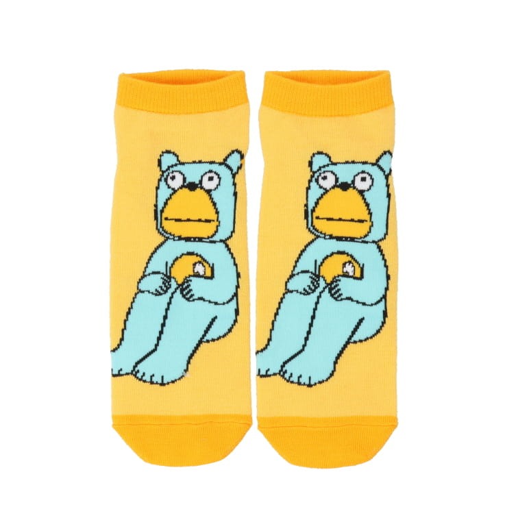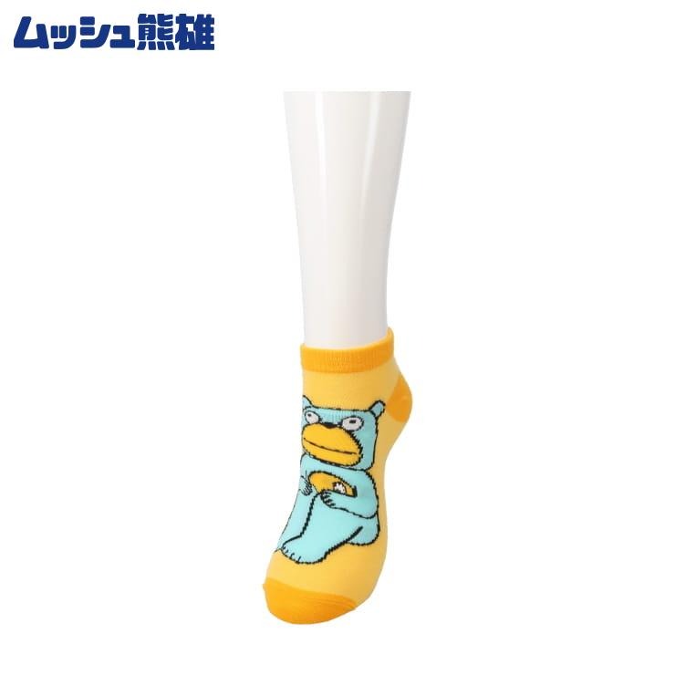 お座りしているムッシュ熊雄がシュールでかわいい!スニーカー丈の靴下です。