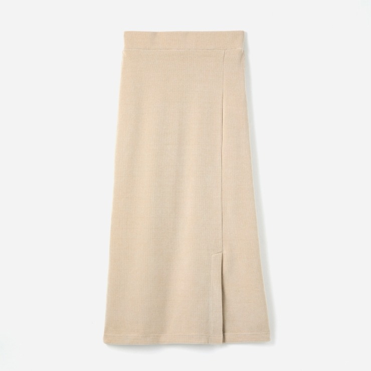 ストレッチ感があり、柔らかな肌触りのよい素材のモールコールのナロースカート。前左裾にスリットが入っており、足さばきがラク。