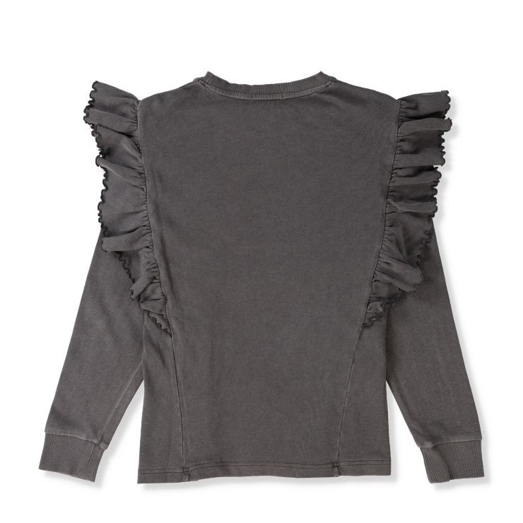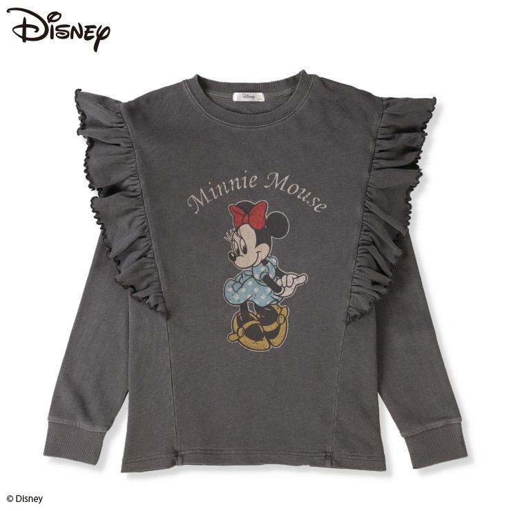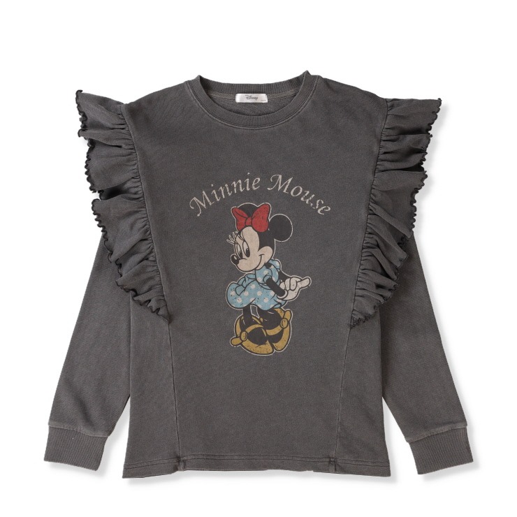 製品染めならではの独特な色合いと古着のような加工感がポイントのDisney「Minnie Mouse」肩フリルデザインの裏起毛プルオーバーです。