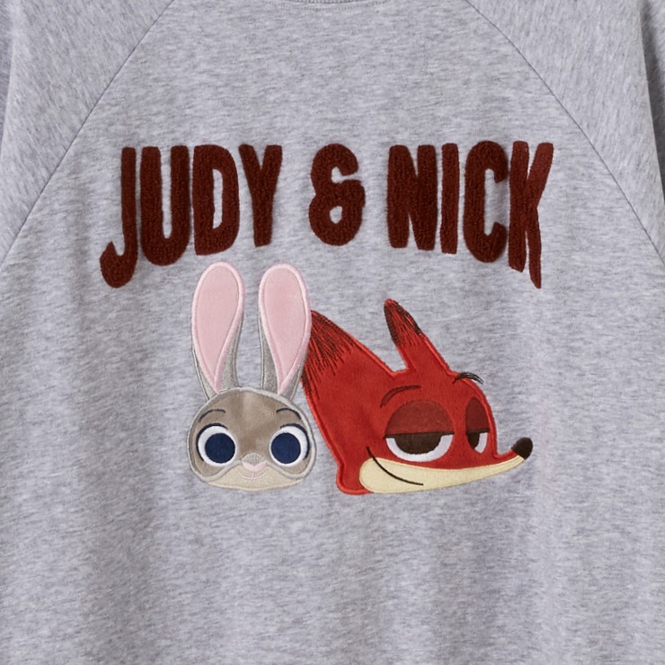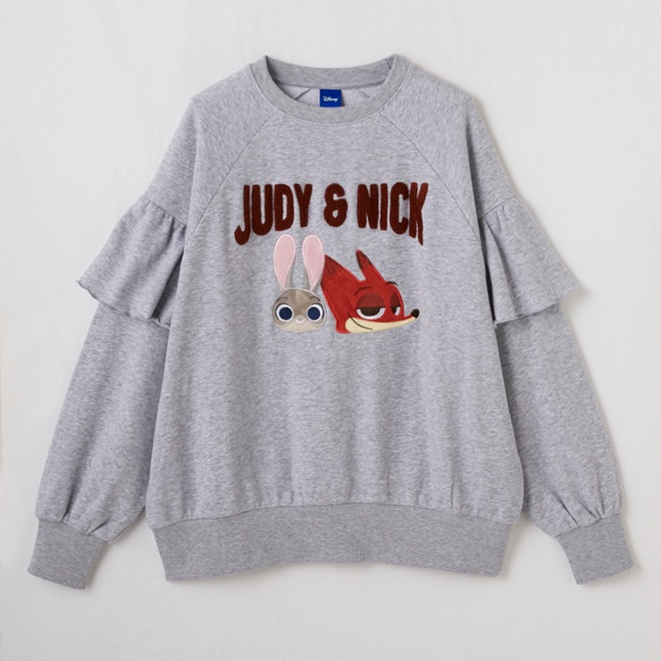 ディズニーとコラボレーションの裏起毛トレーナーは、ズートピアのニックとジュディのプリント入り。