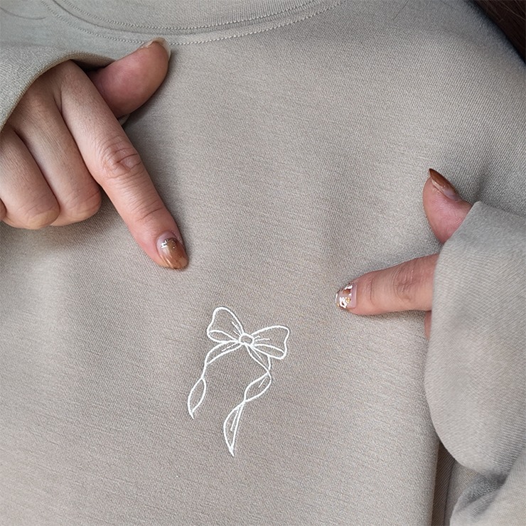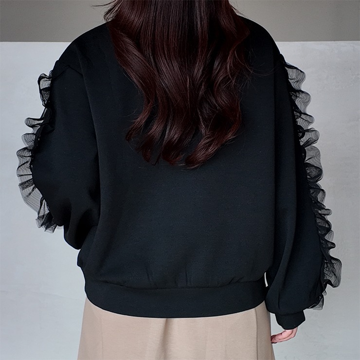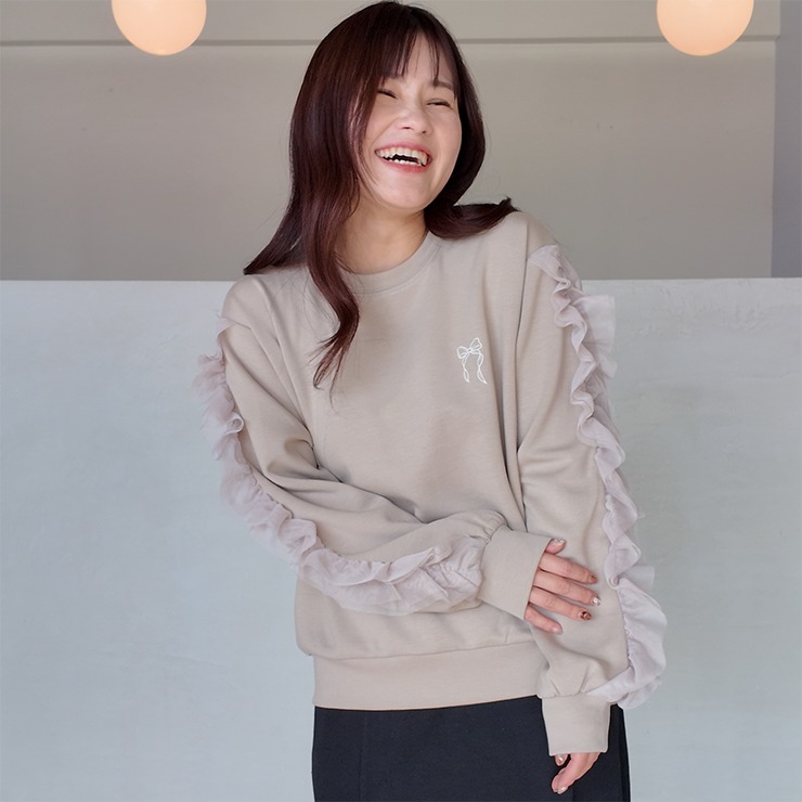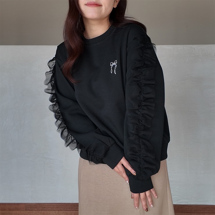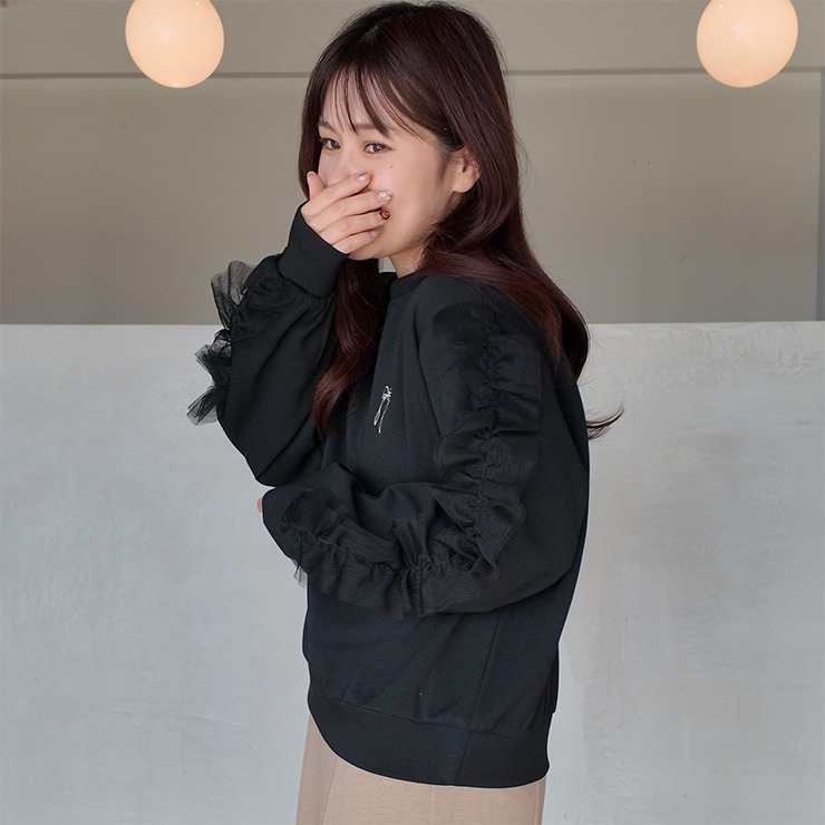 胸元のリボン刺繍とチュールフリルを施した袖デザインがポイントのトップスです。
