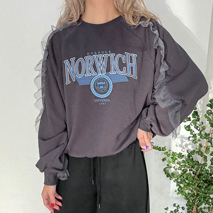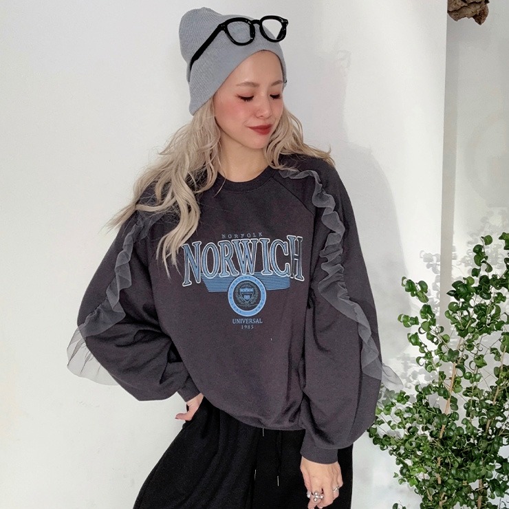 ネックから後ろ袖まで大胆に入れたチュールフリルが着映えする裏毛素材のスウェットトップス。