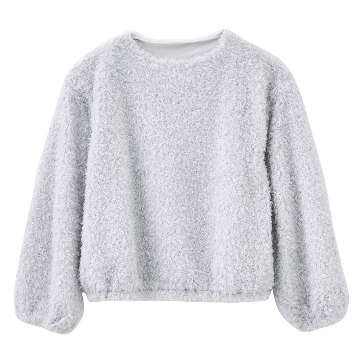ふんわりとしたプードル調のシャギー素材が魅力のトップスです。軽やかな着心地とほどよくゆとりのあるシルエットがリラックス感を演出します。デニムやスカートなど、さまざまなアイテムと好相性で、カジュアルにもフェミニンにも着こなせる万能な一枚です。