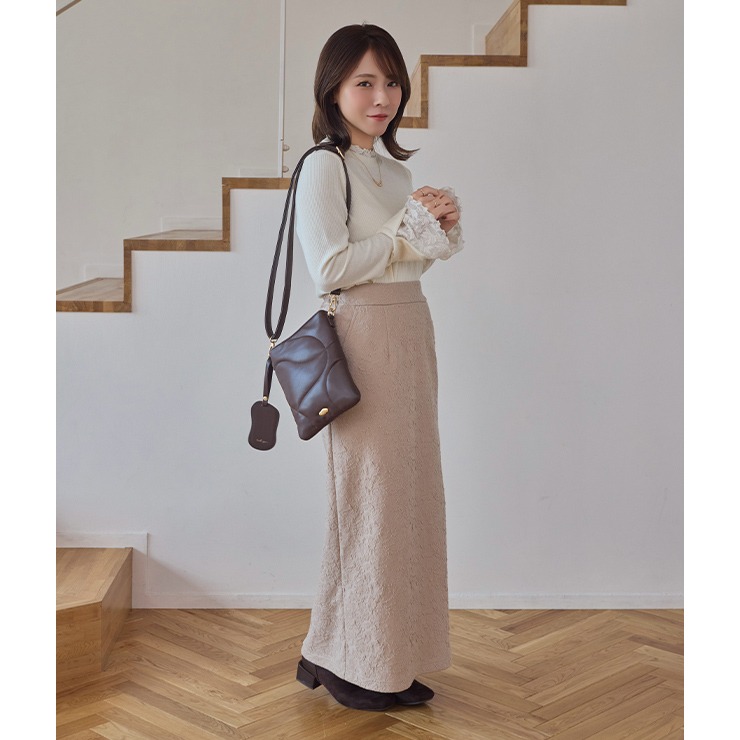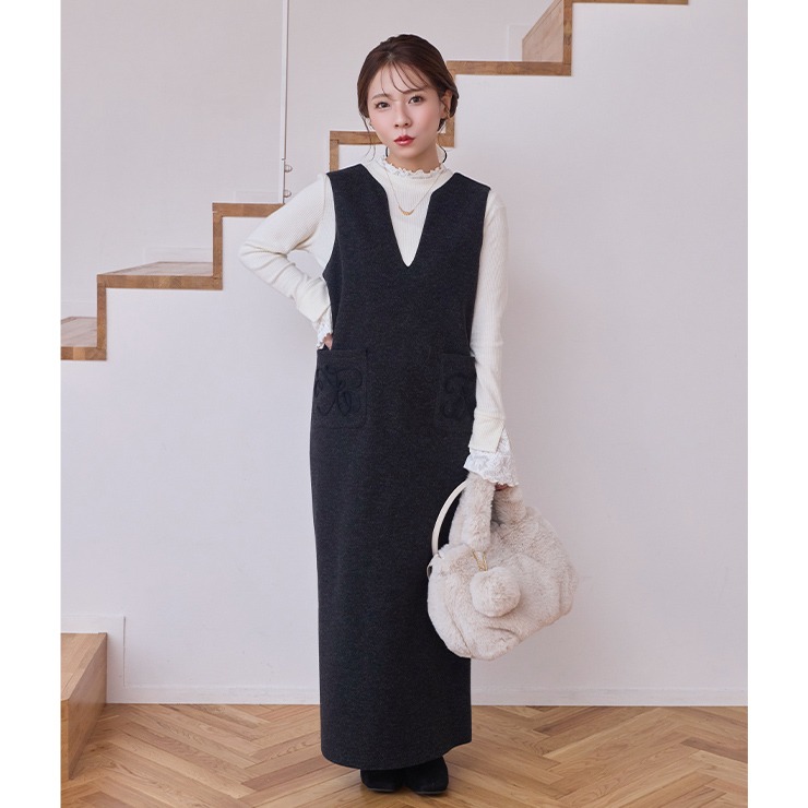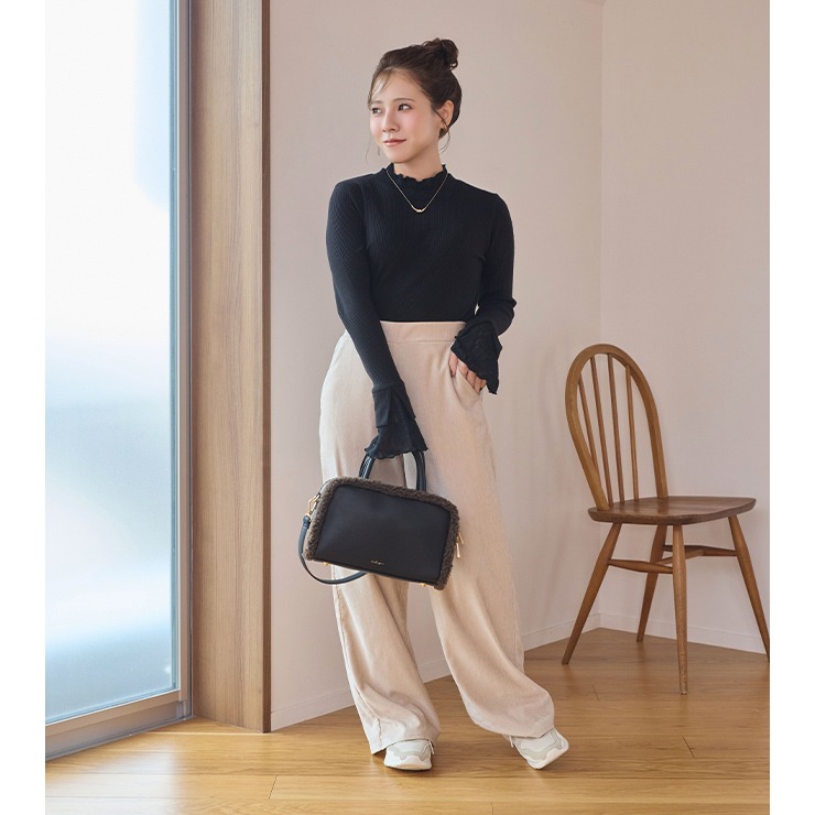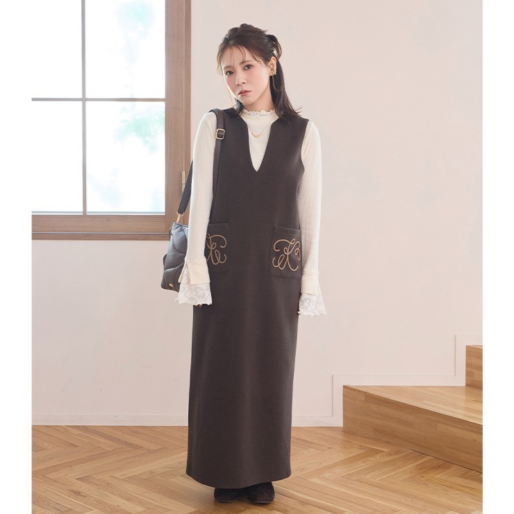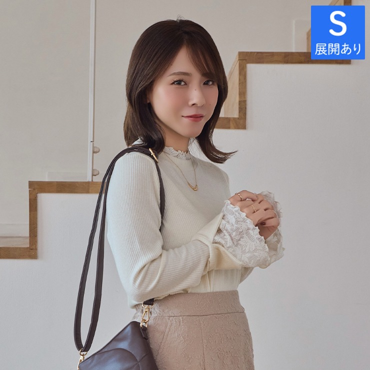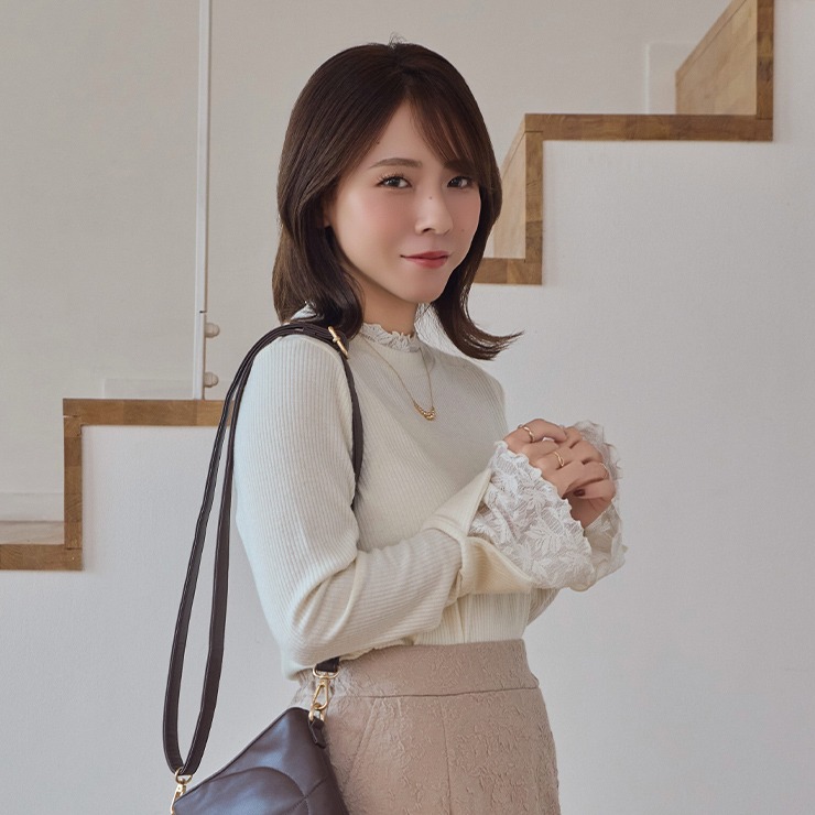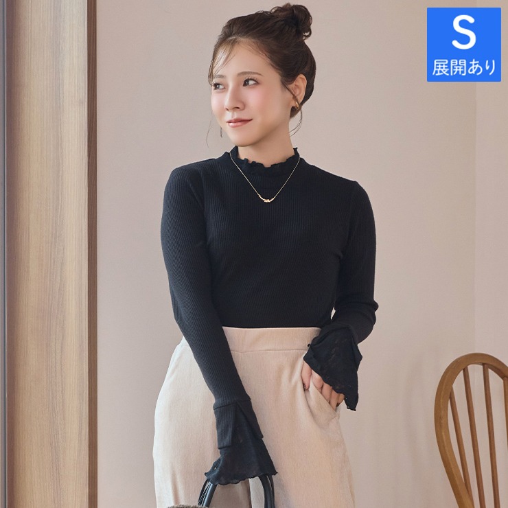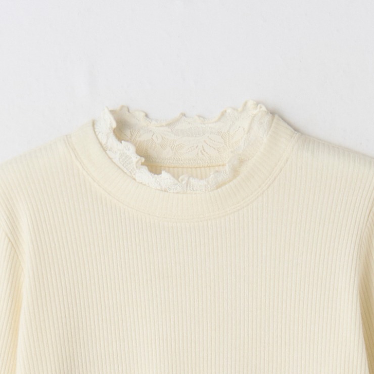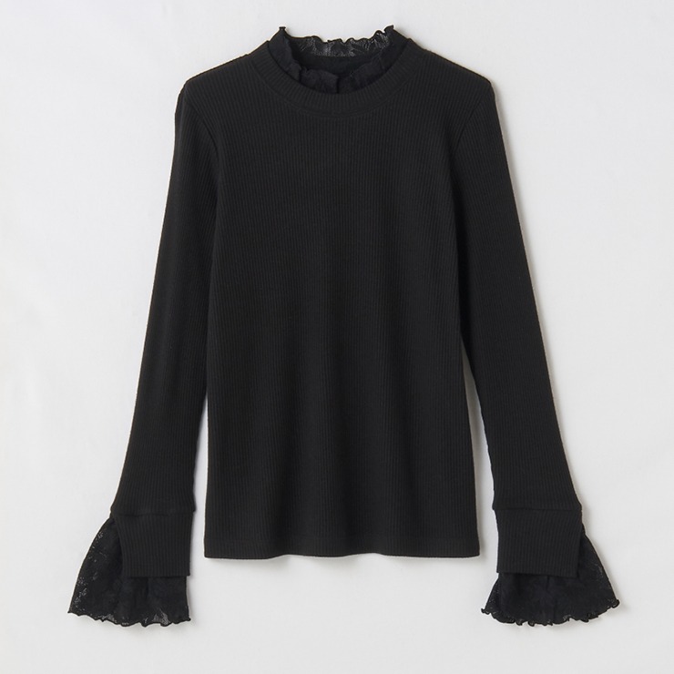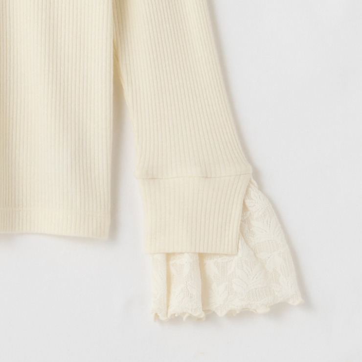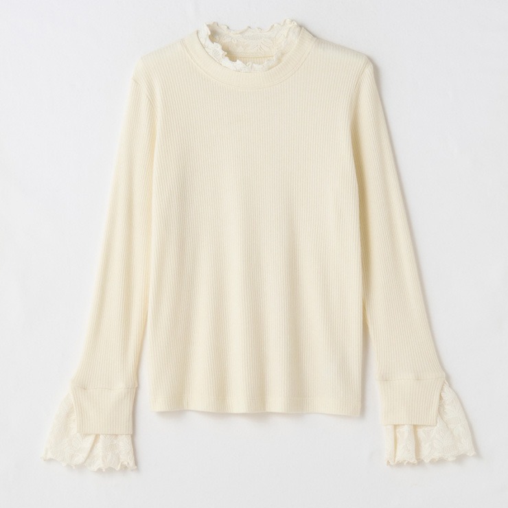 衿元と袖口にレースをレイヤードしたプルオーバーです。リーフ柄のクラシカルなレースが上品かつ華やかな印象にしてくれます。柔らかくなめらかなリブ素材で着心地よい一枚です。程よいサイジングでジャンパスカートやジャケットのインナーにもぴったりです。