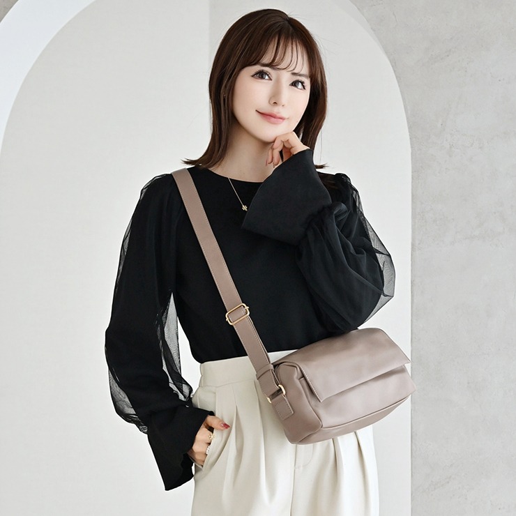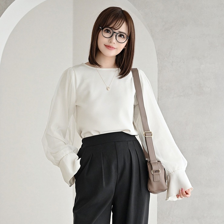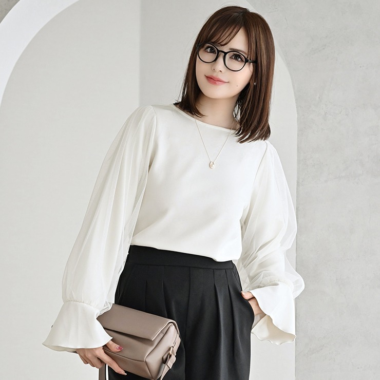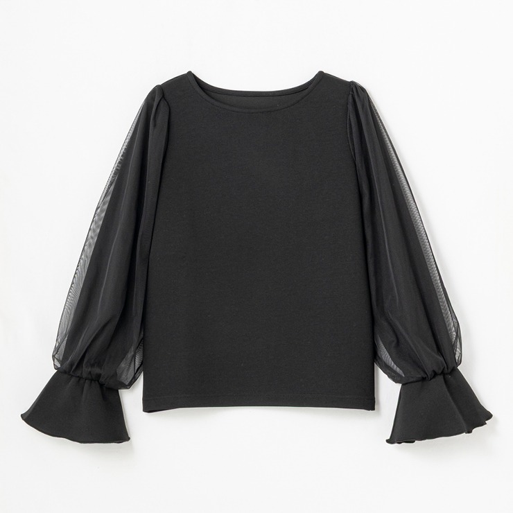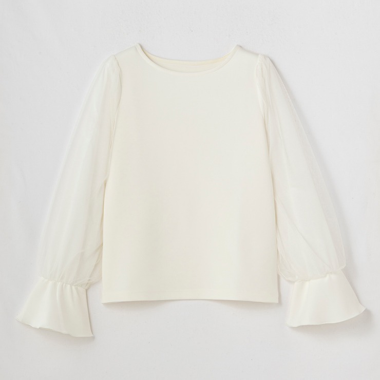 袖にチュールを重ねたデザインが、1枚で華やかな印象を与えるプルオーバーです。なめらかな肌触りと上品なハリ感が魅力のダンボール素材を使用。シンプルな中にもほどよい甘さがあり、合わせるボトムによってさまざまなスタイリングを楽しめます。