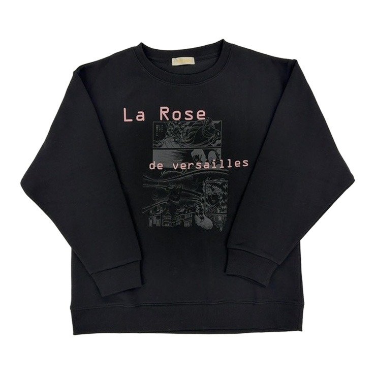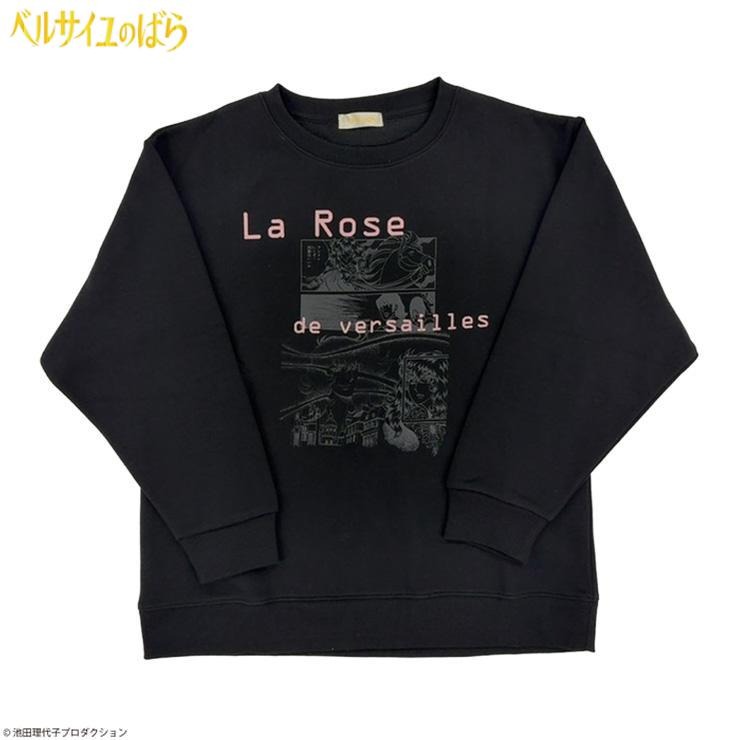 裏起毛であたたか。黒地にピンクロゴが大人の甘さをひとさじ!ほどよいゆるさで体型カバー&重ね着ラク。ベルばらのモノトーンアートがコーデの主役に。袖裾リブで冷気ガード♪