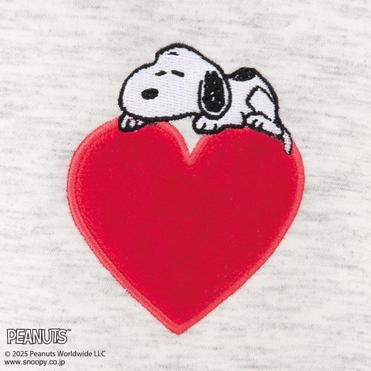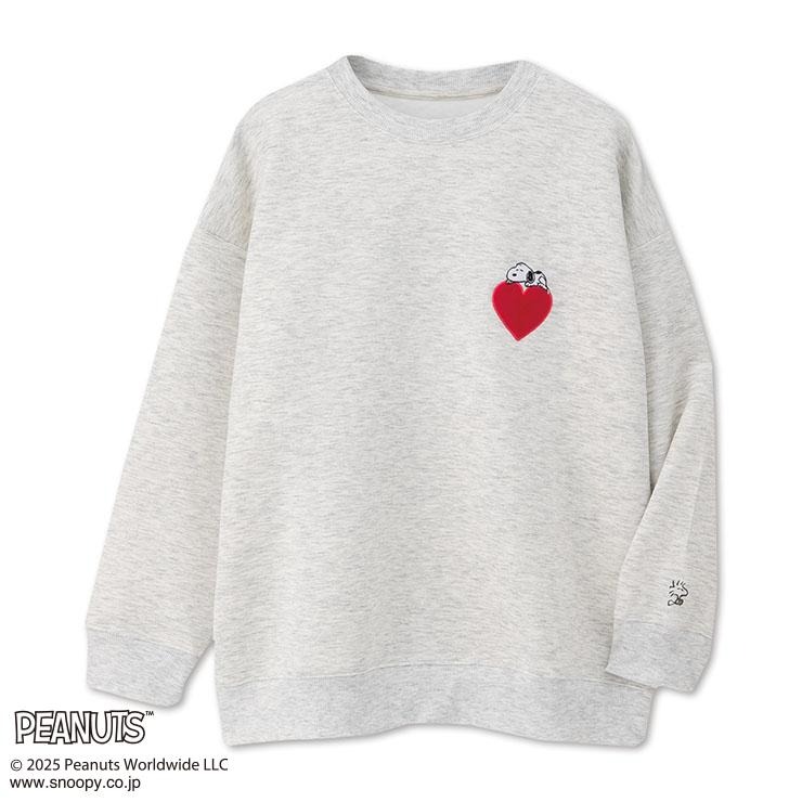 ハートの上に寝転んでいるスヌーピーのデザインが可愛いトレーナーです