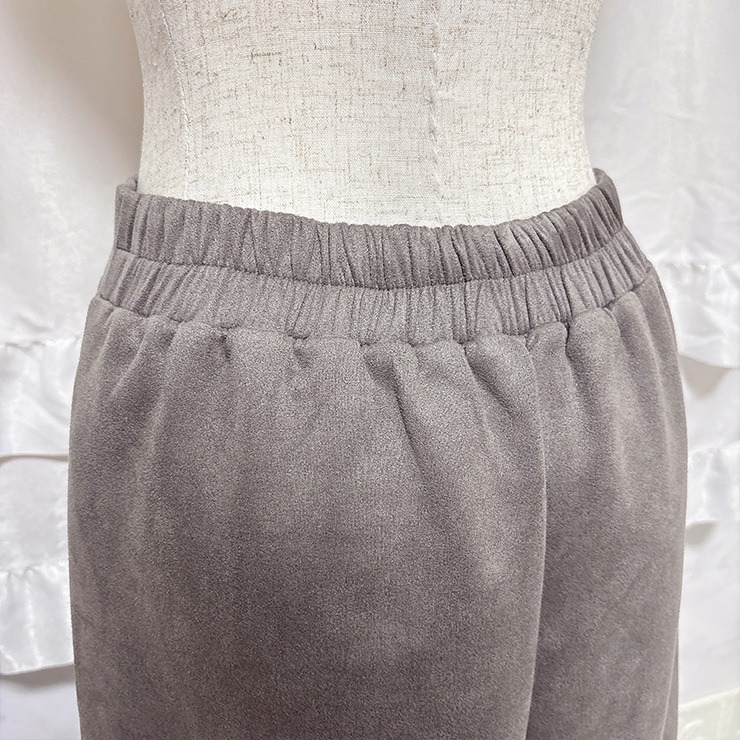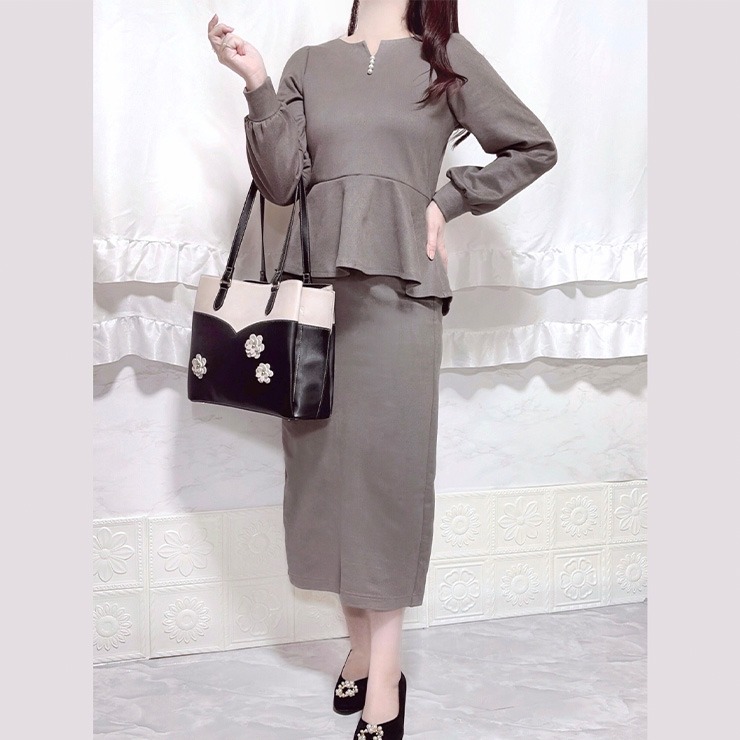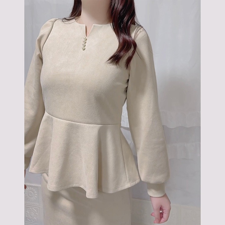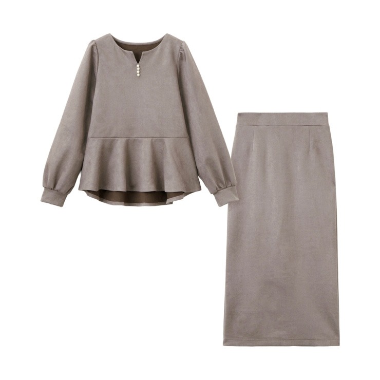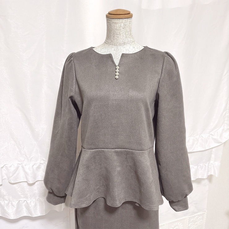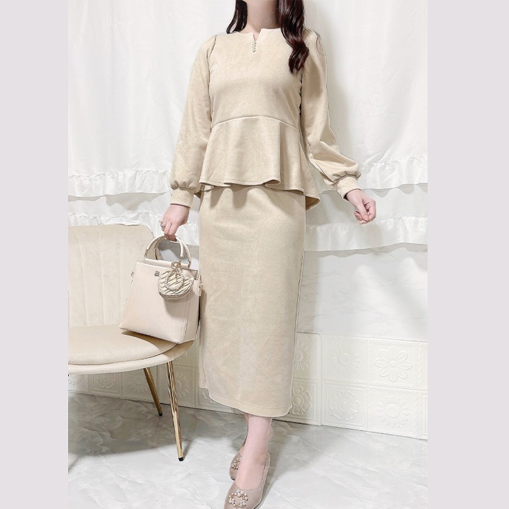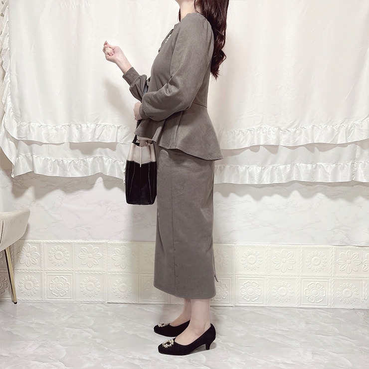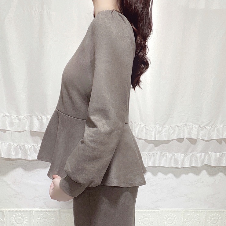微起毛ポンチ素材を使用した、ペプラムトップスとスリット入りナロースカートのセットアップです。
