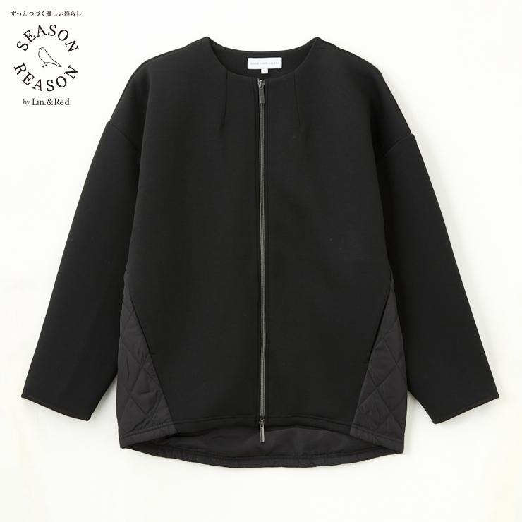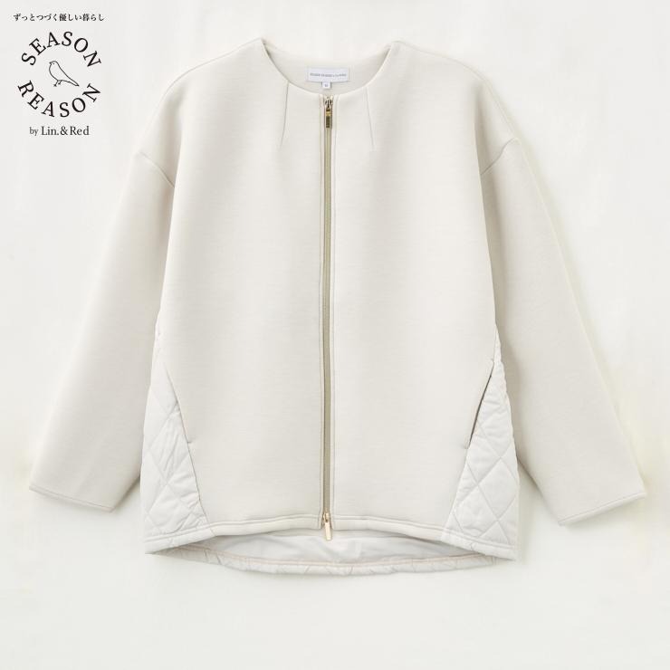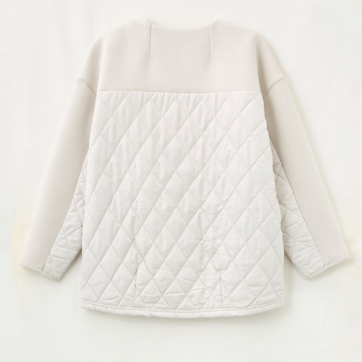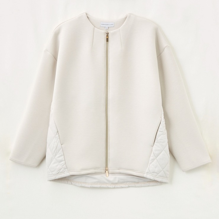 上品な光沢とほどよいハリ感が魅力の“ダンボール素材”と、柔らかなキルティング素材を組み合わせた、秋冬にぴったりのノーカラーブルゾン。