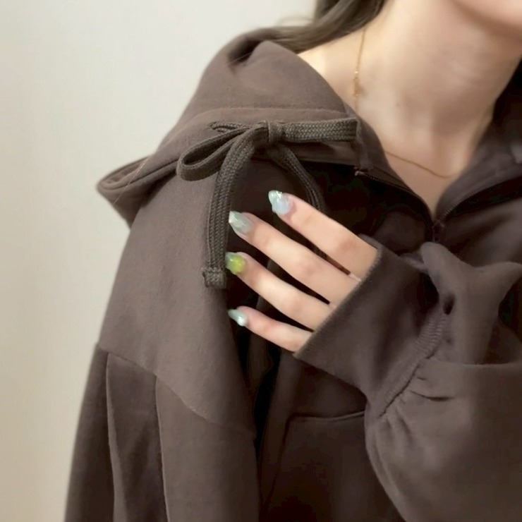 フードの紐は2本通してリボンを作りさりげないアクセントに!