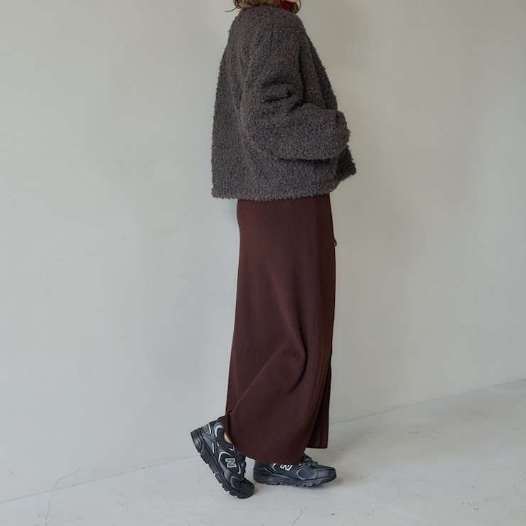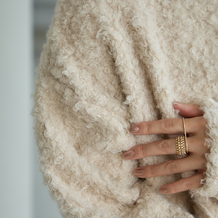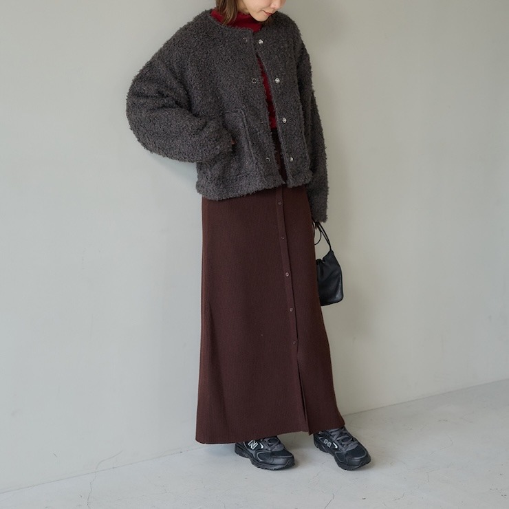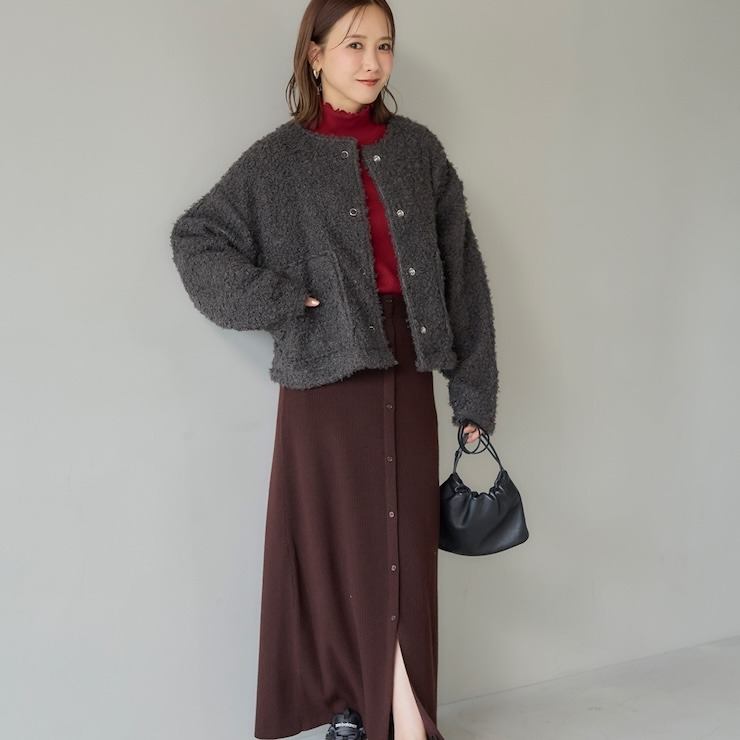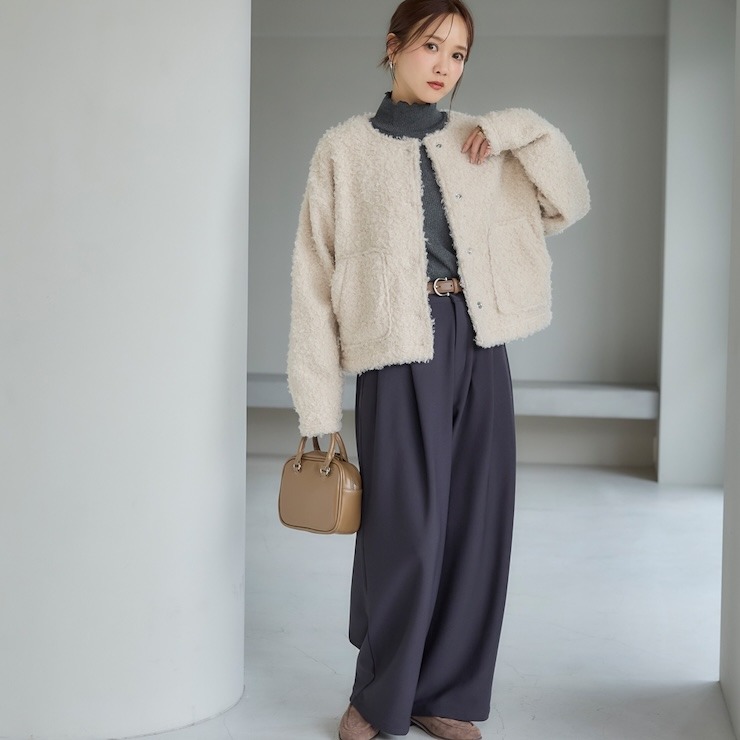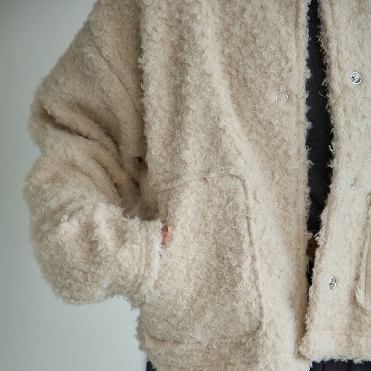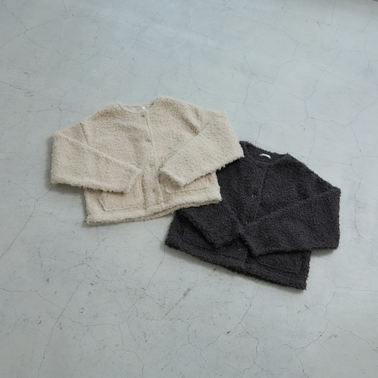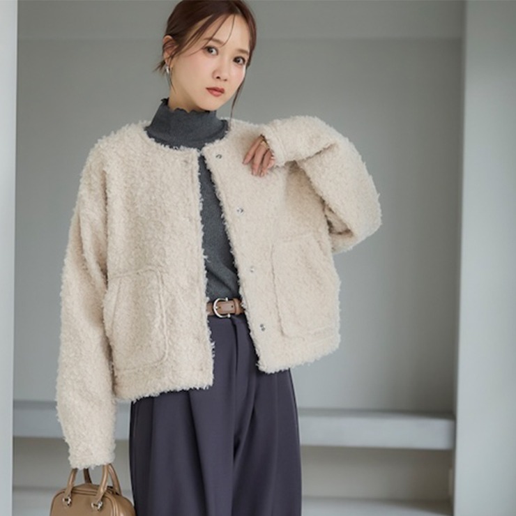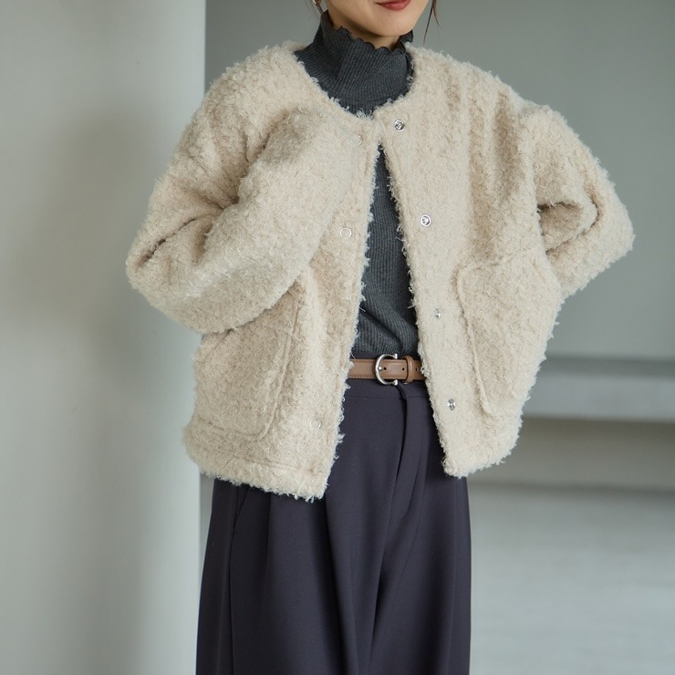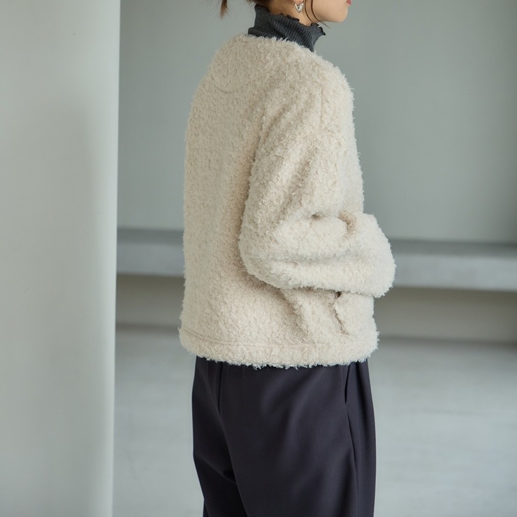 もこもことしたカットボア素材が可愛い軽アウターです。