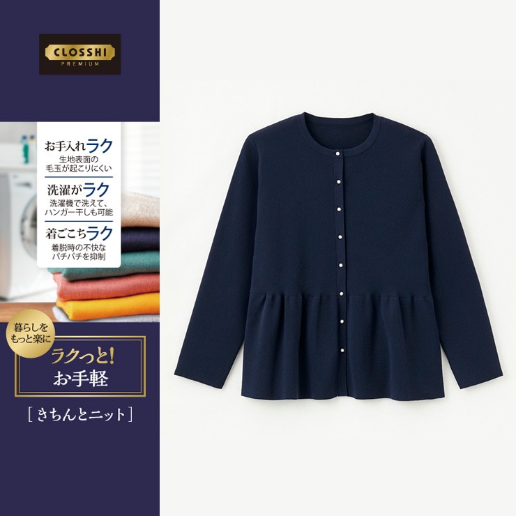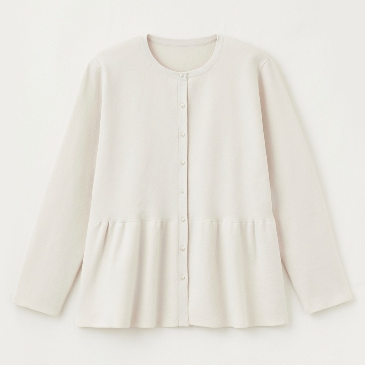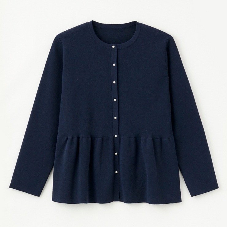キレイめにもカジュアルにも着まわせるペプラムシルエットのカーディガンです。スタイルアップと柔らかな印象を与える1枚です。