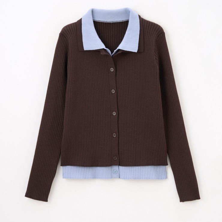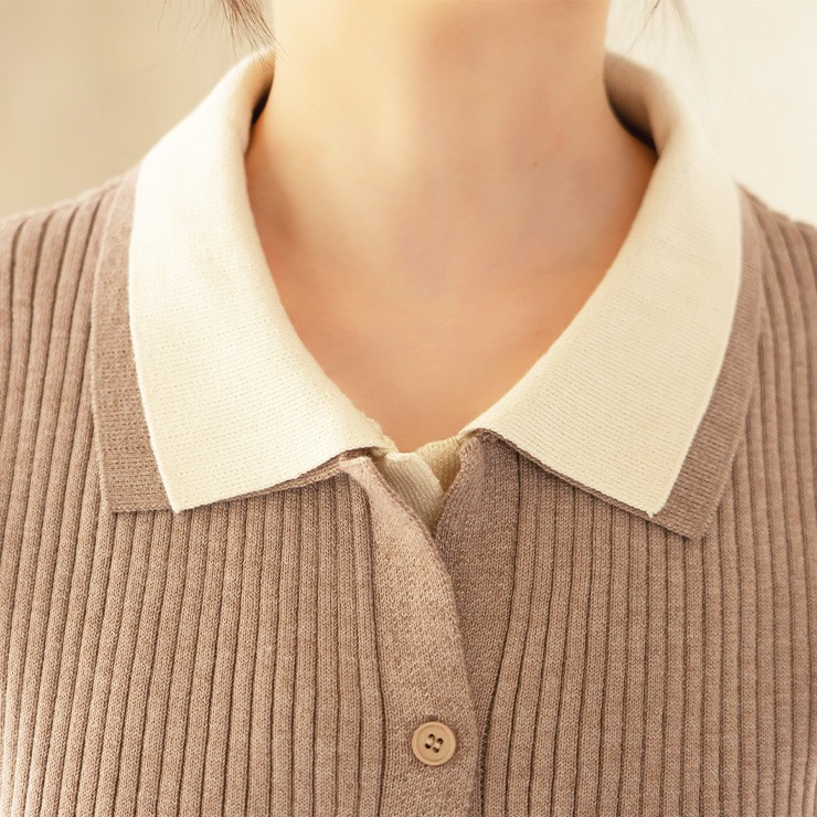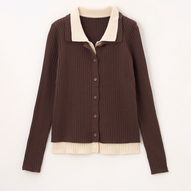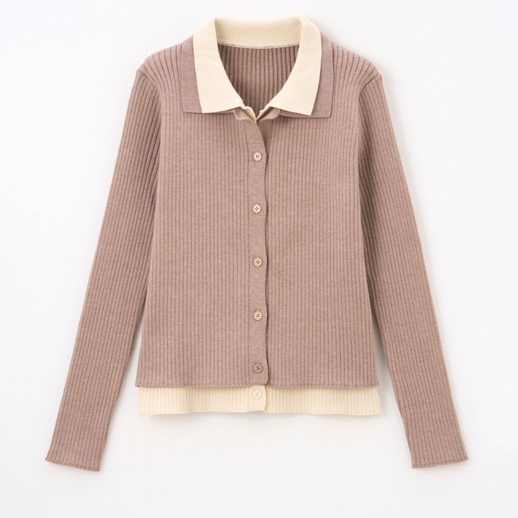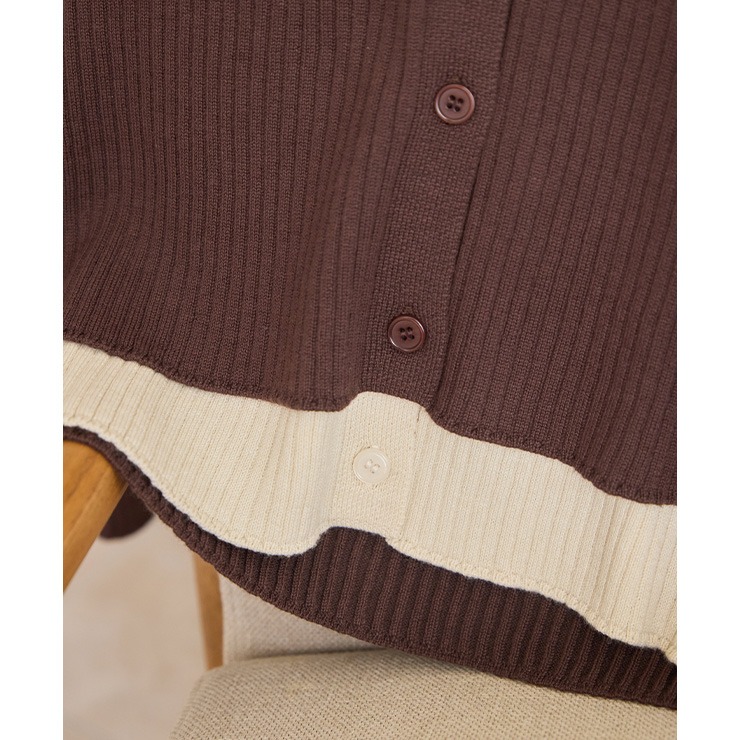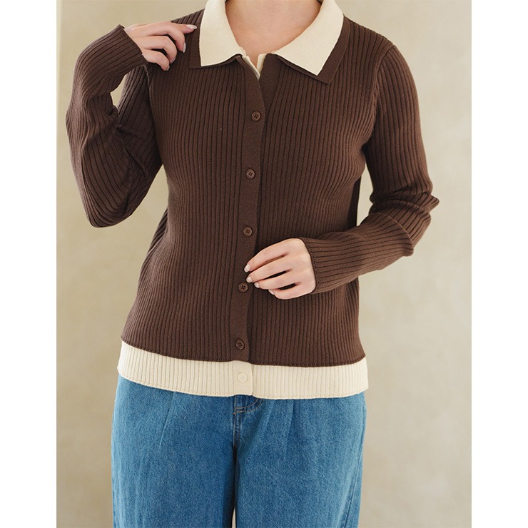 配色が可愛い“ダブル衿”が目を引くリブカーディガン。