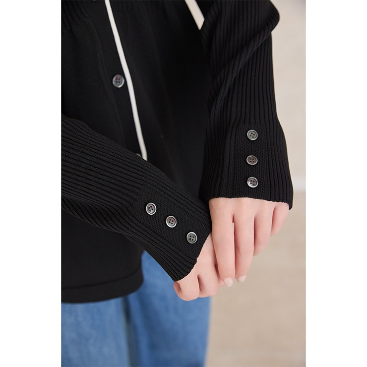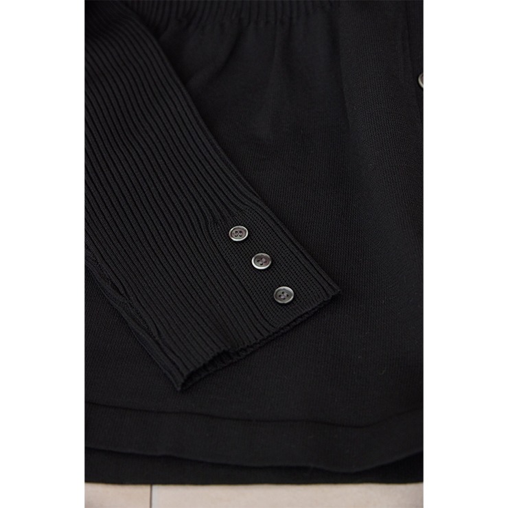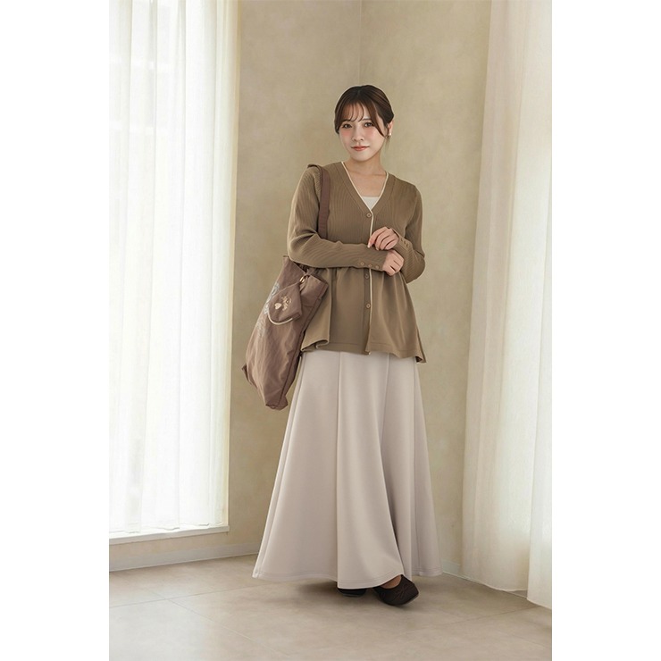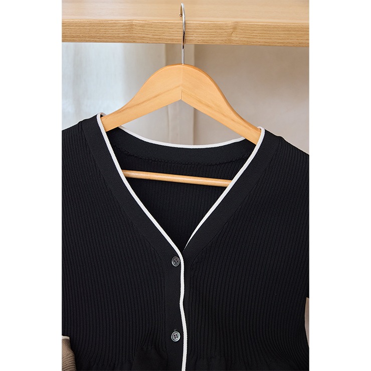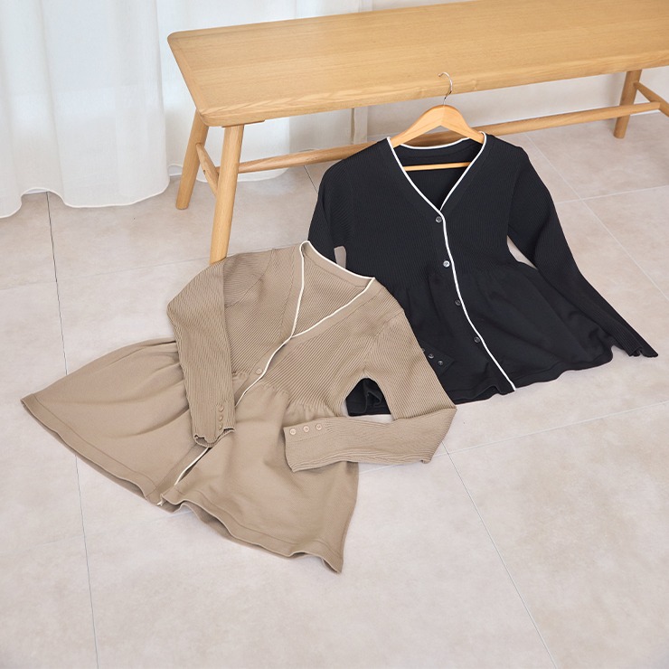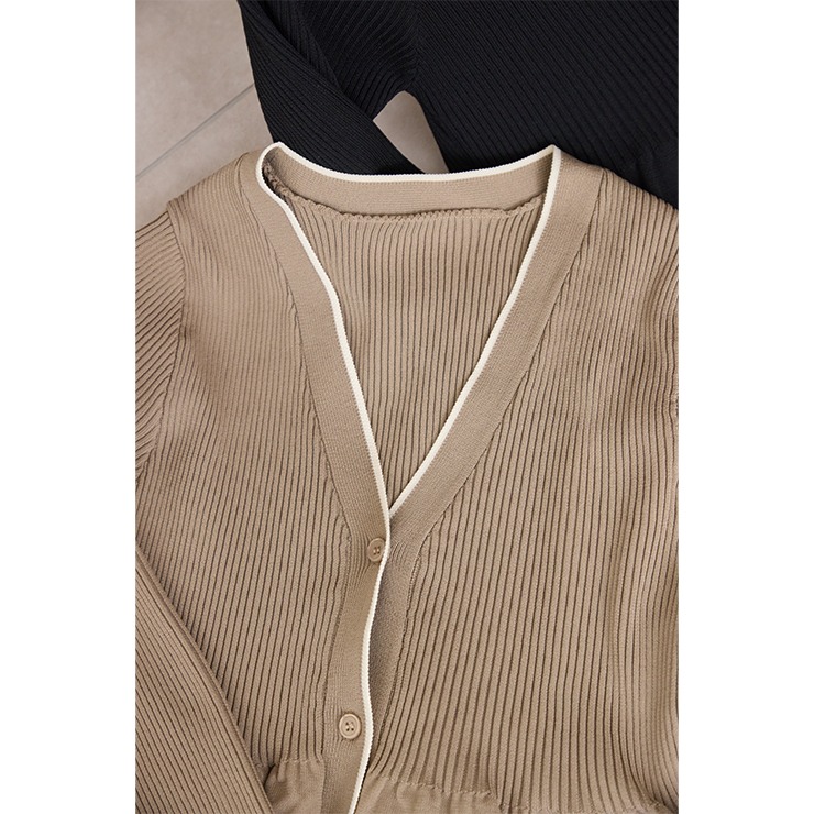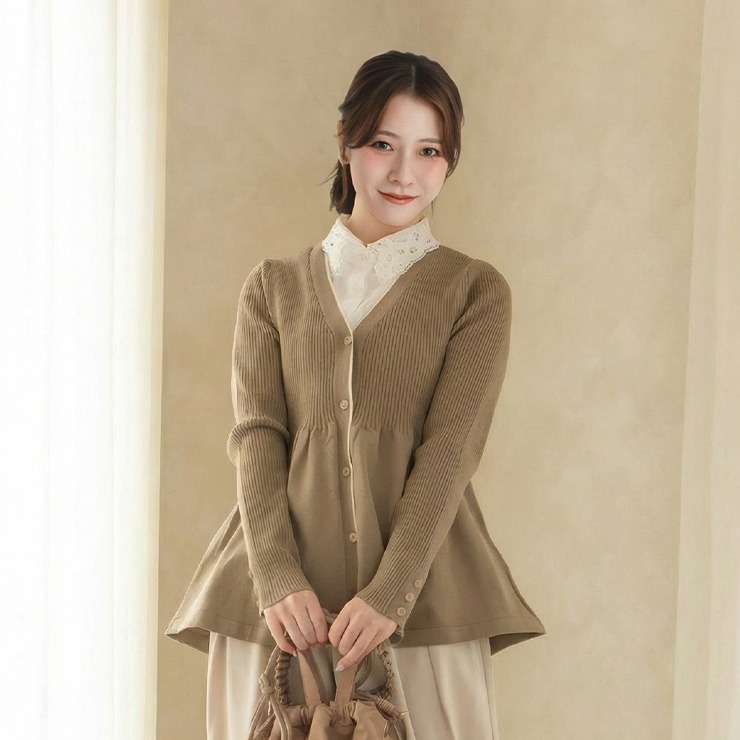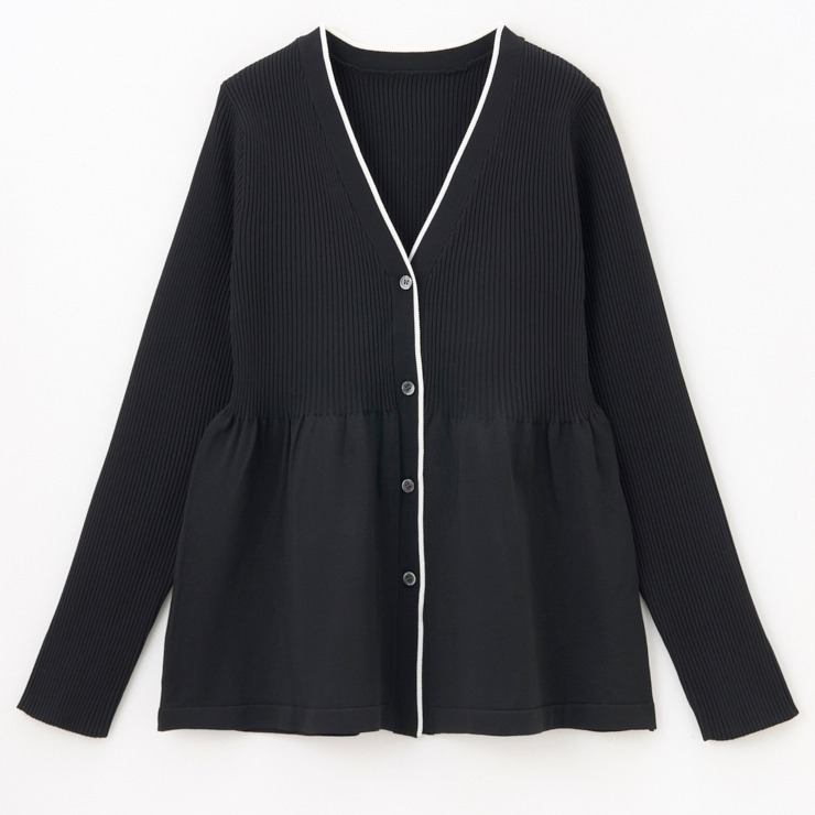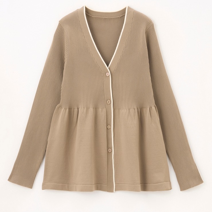 リブ切り替えのペプラムVネックカーディガン。