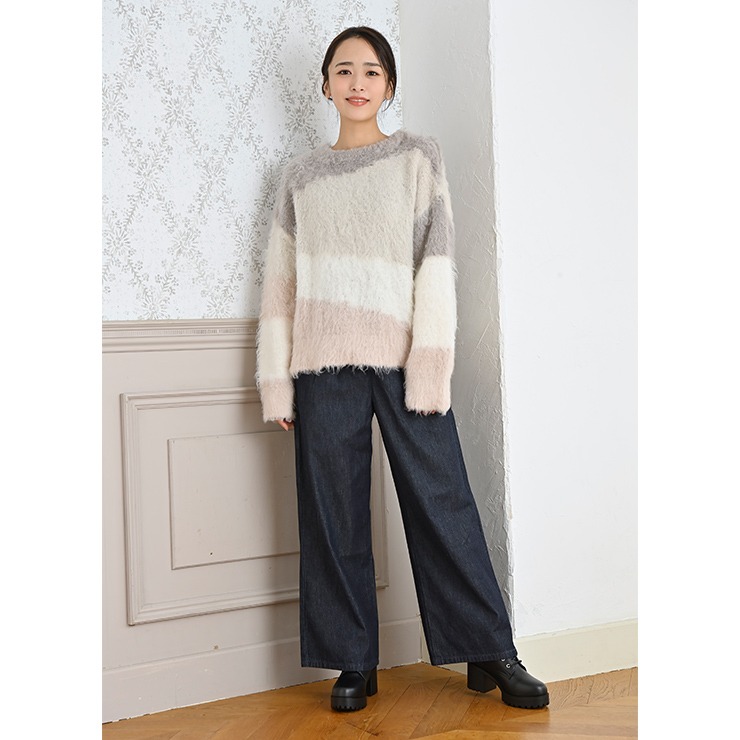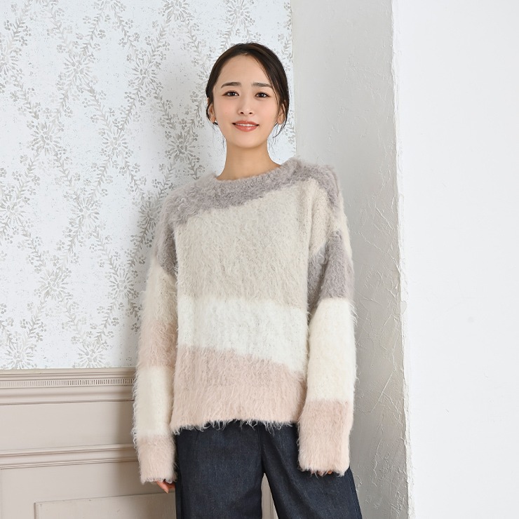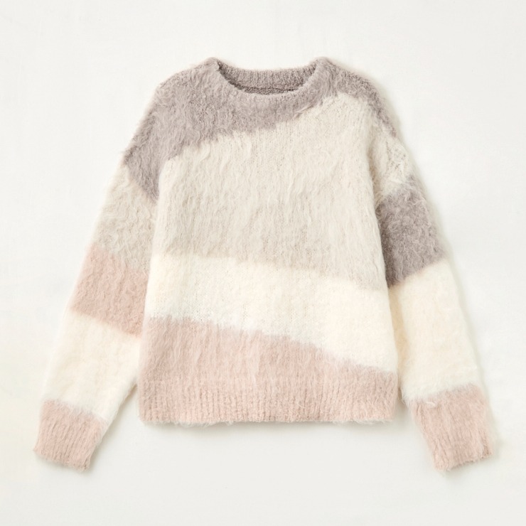 ウェーブした糸の質感が新鮮な配色ニットプルオーバーです。