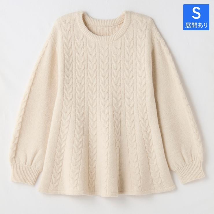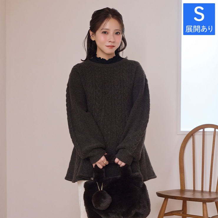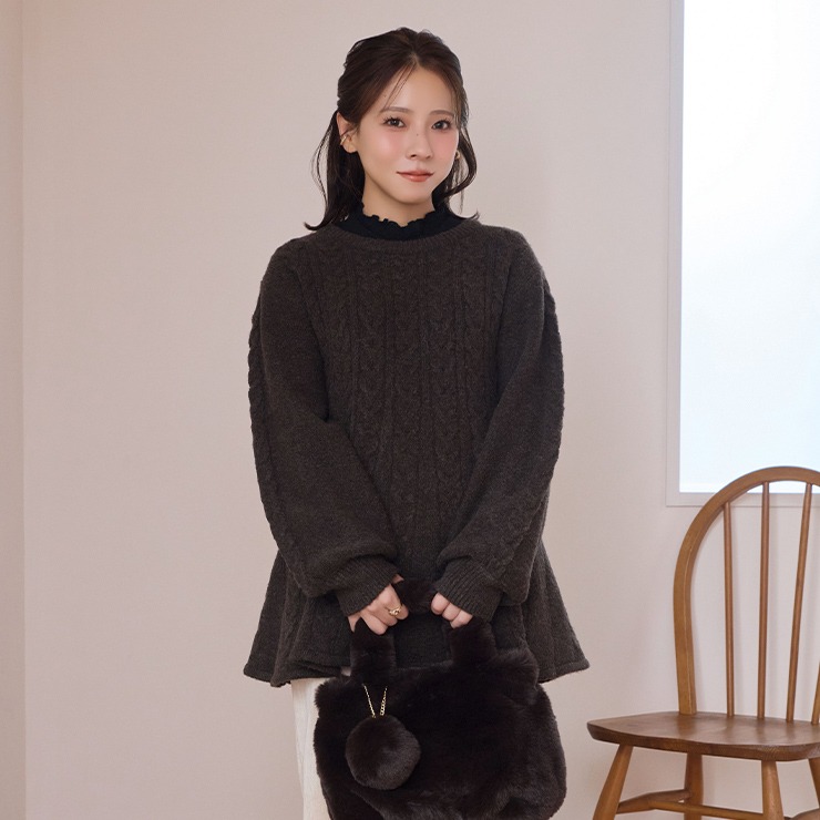 ケーブル柄の編地とフレアシルエットが女性らしいチュニック丈のニットです。