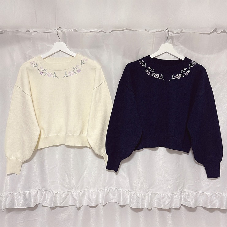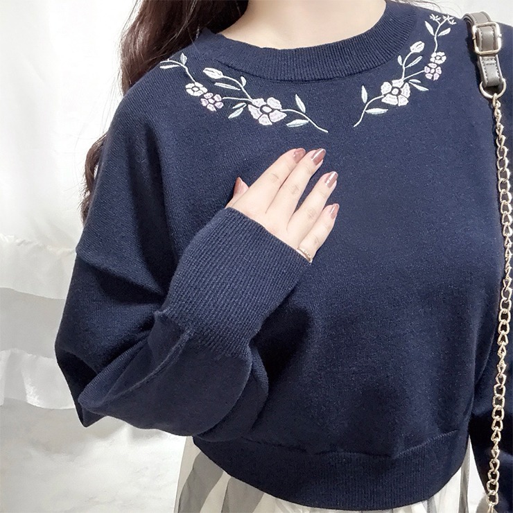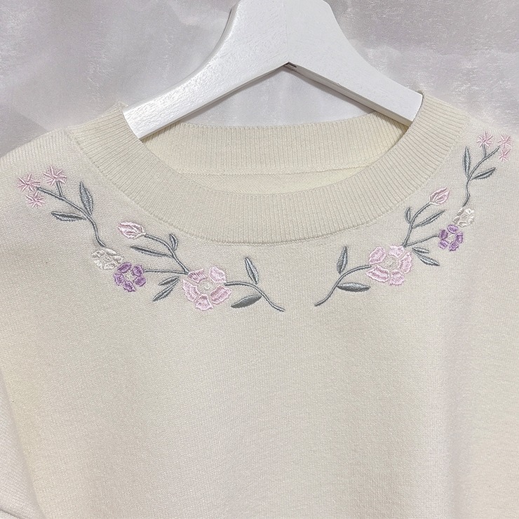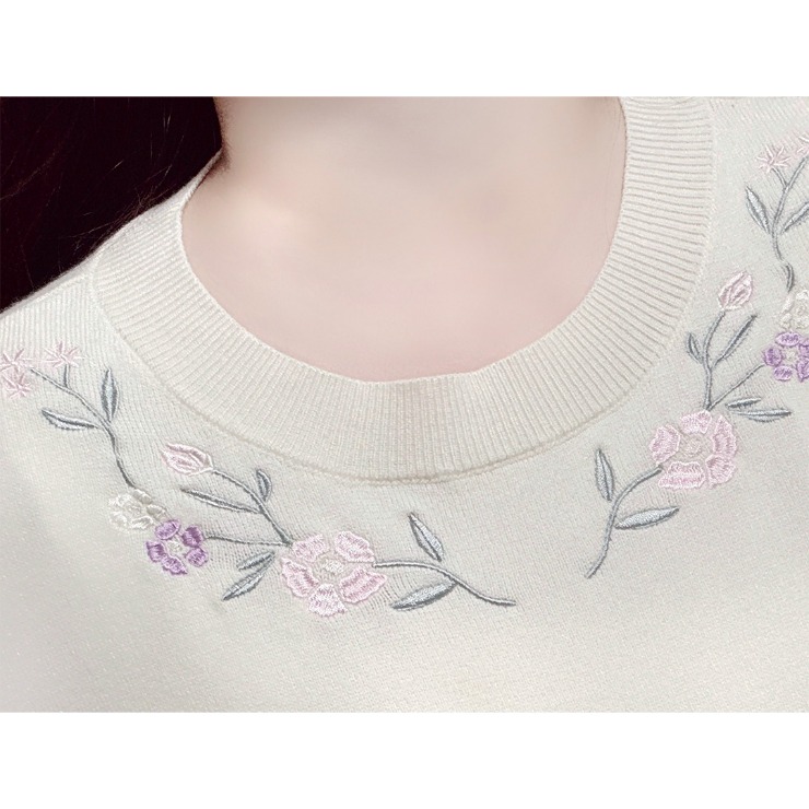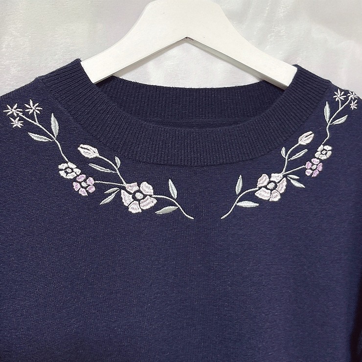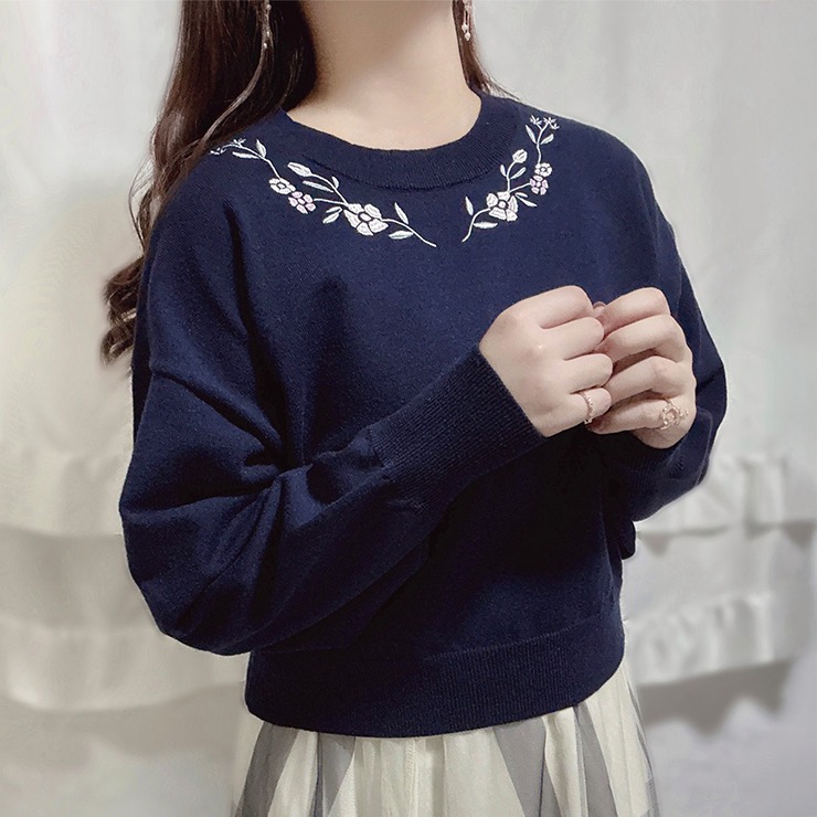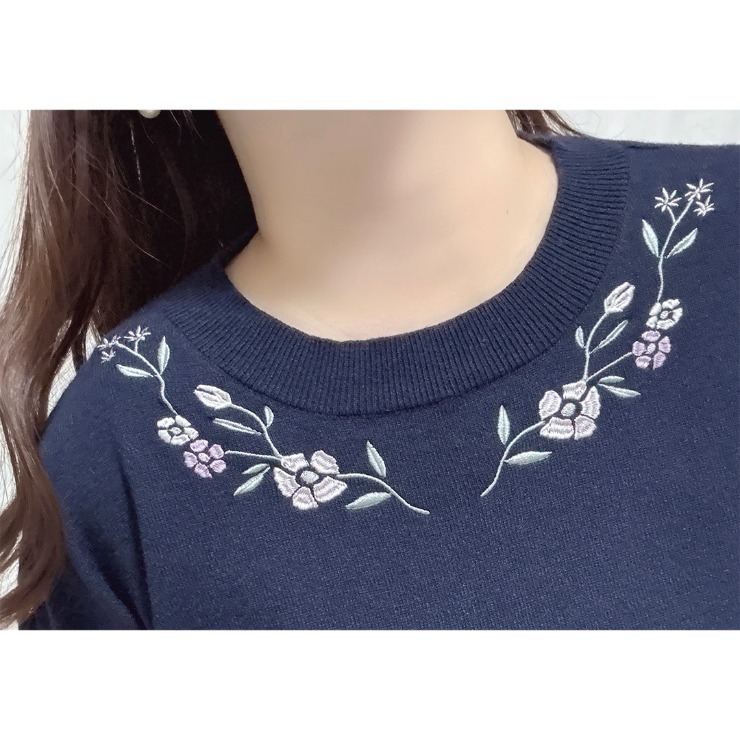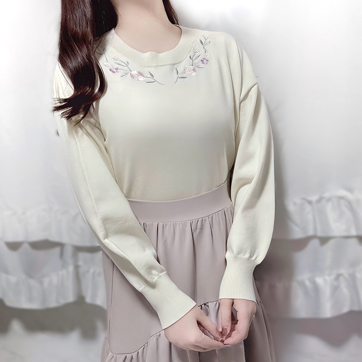 フロントのフラワー刺繍がポイントのニットプルオーバーです。