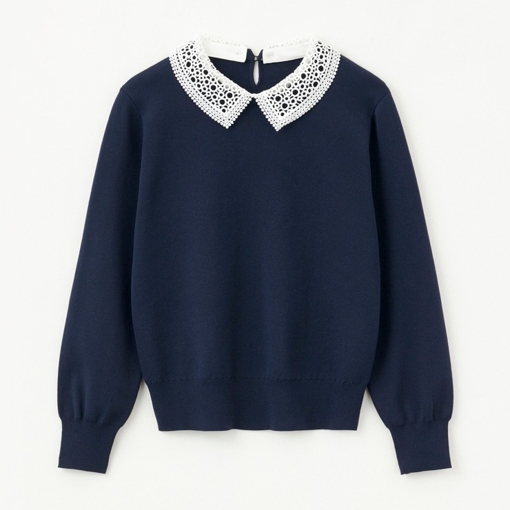 トレンドのレース衿が着映えするプルオーバーです。キレイめ、カジュアルどちらにも着まわせる1枚です。