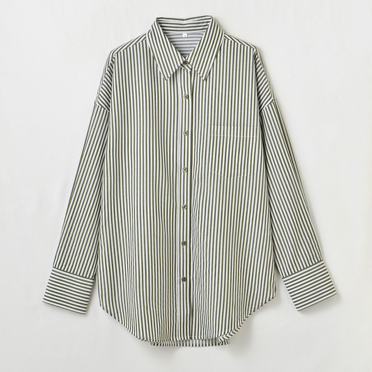 ビッグシルエットで、ヒップまですっぽりかくれるシンプルで着回し力抜群なシャツです。ストライプ柄が引き締まったイメージを与えます。