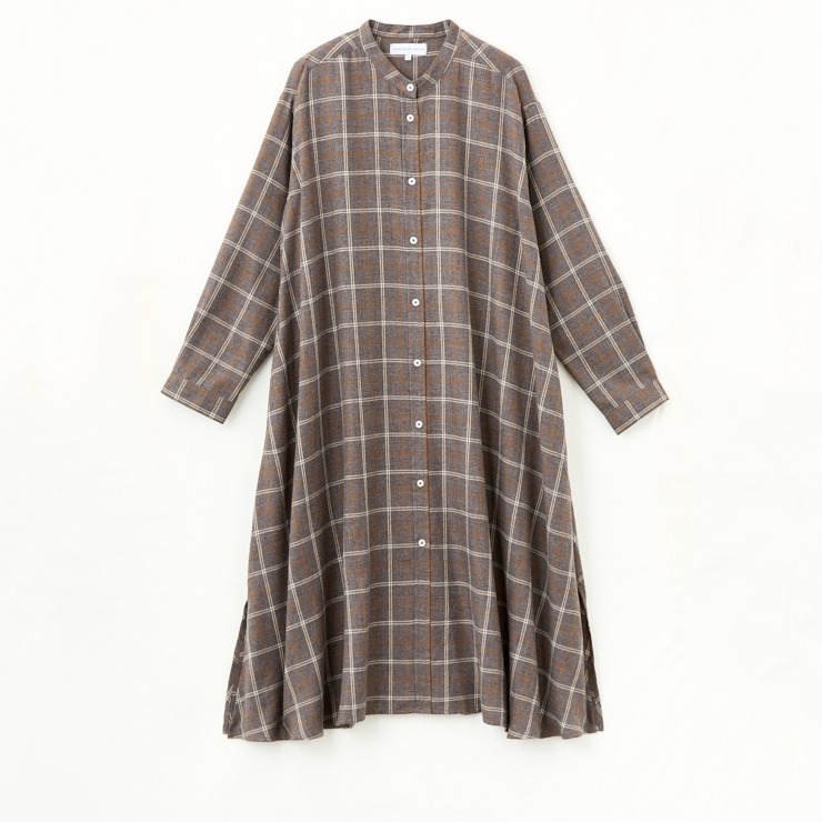 バンドカラーAラインワンピースはさらりと1枚でも重ね着にもコーディネイトできる1枚です。