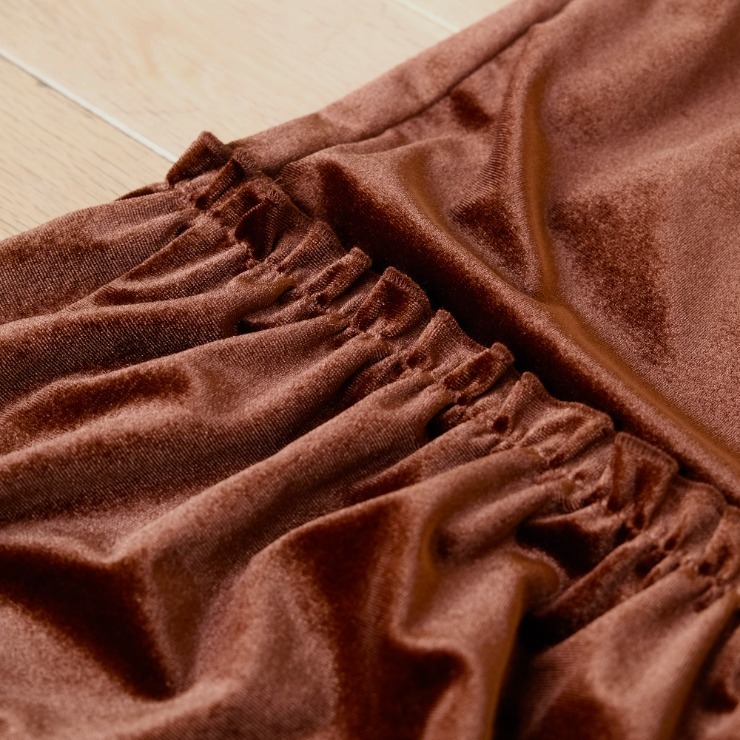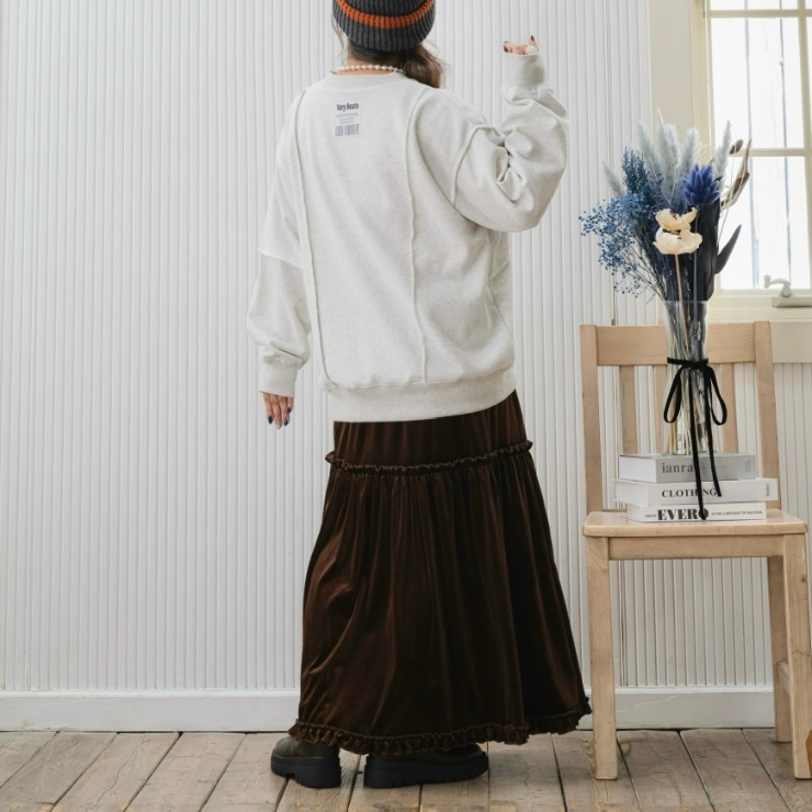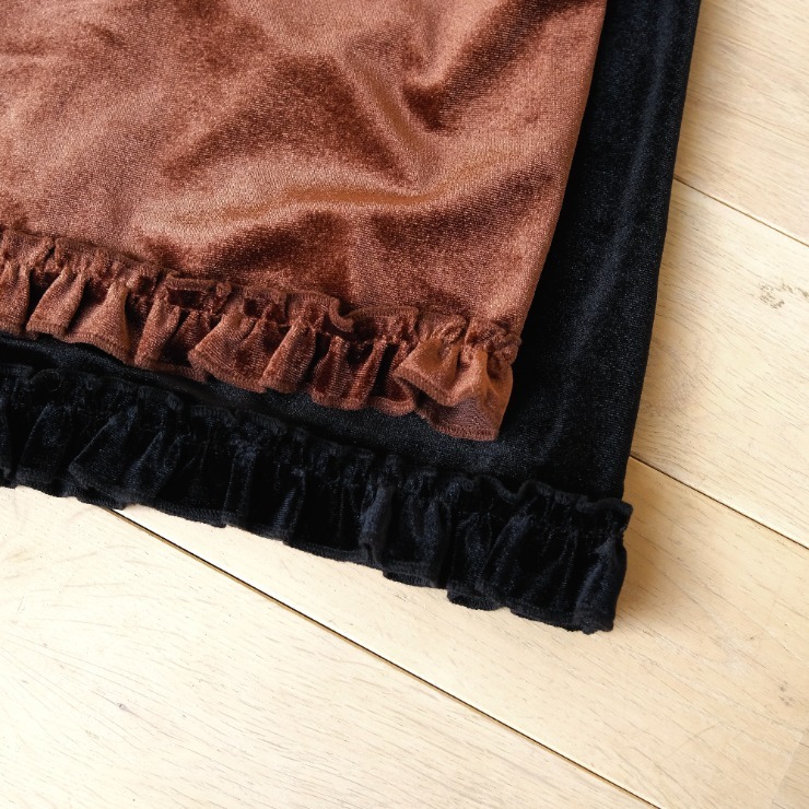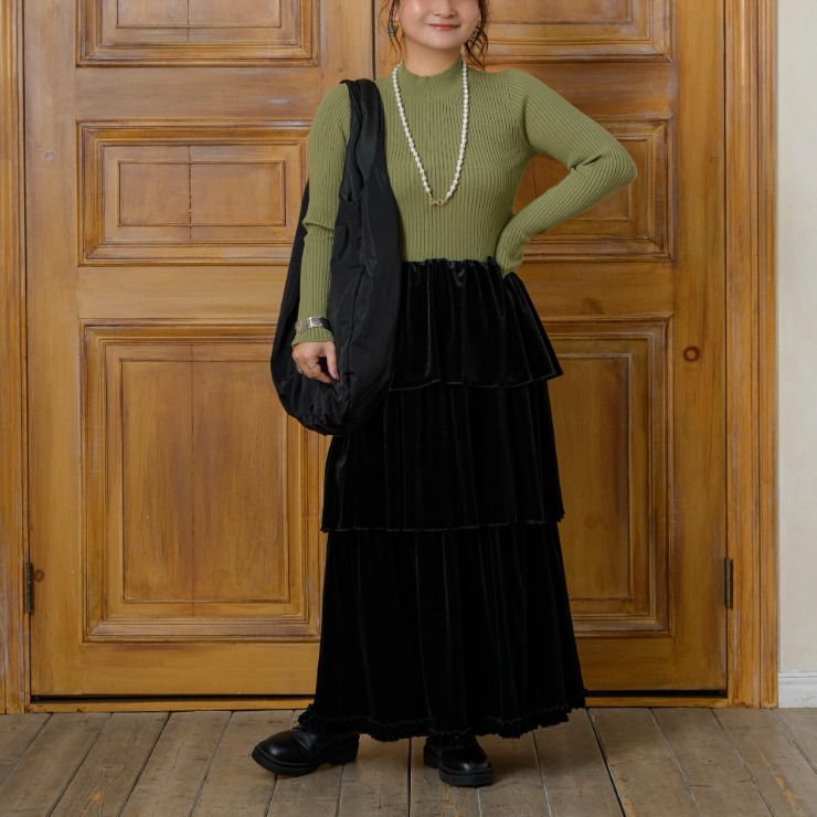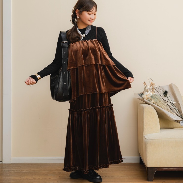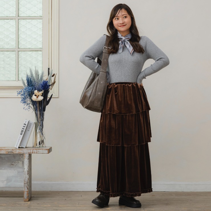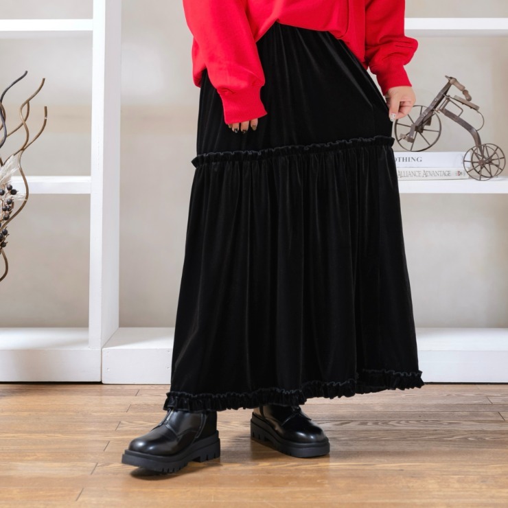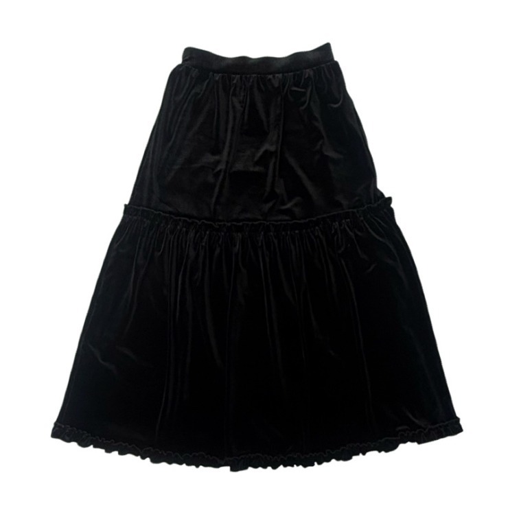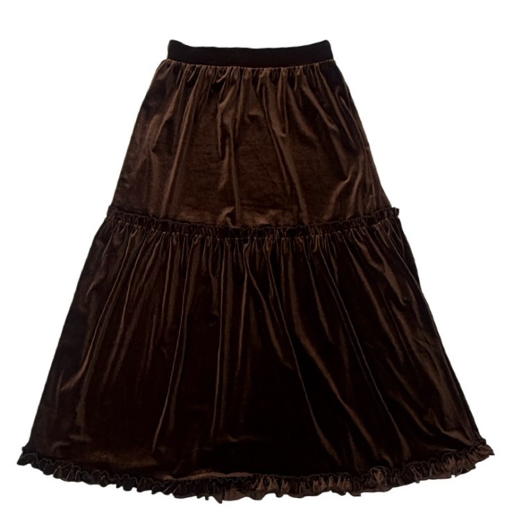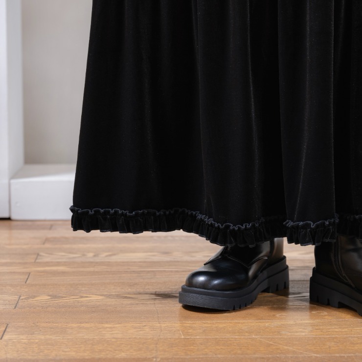 ベロアスカートシリーズ。 今年はフリルを加えてふわっとフレアシルエット。