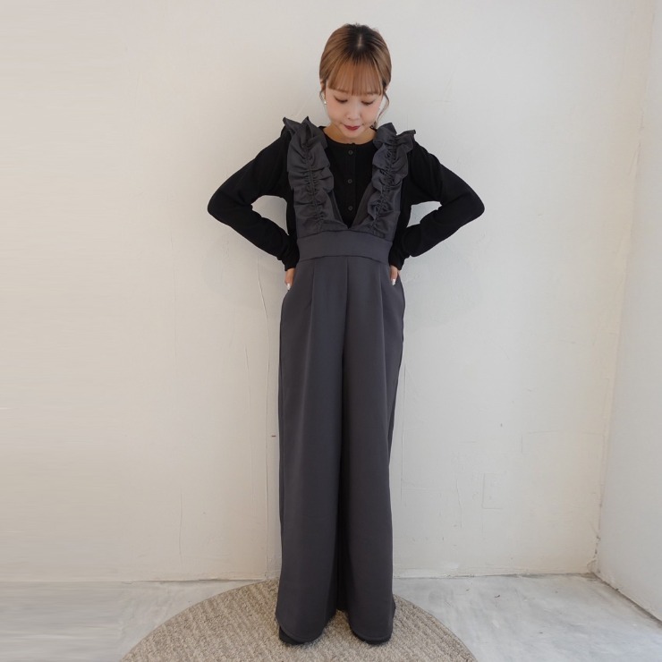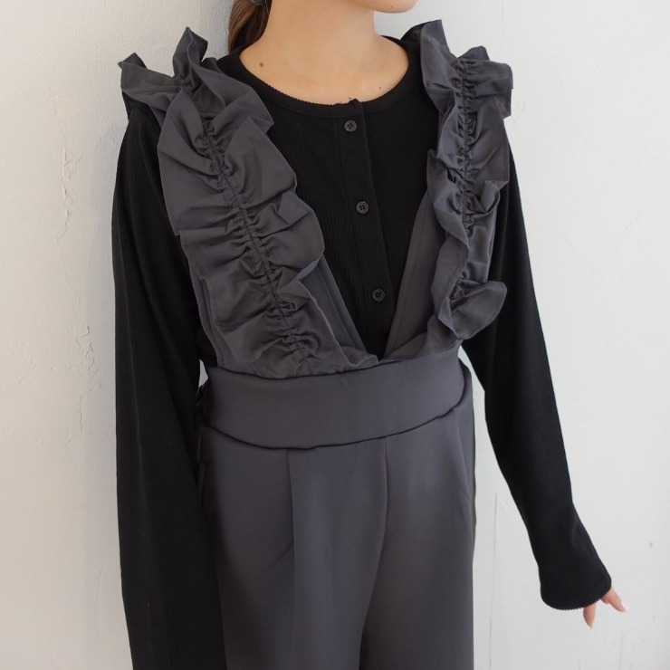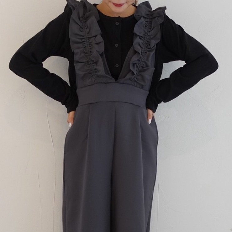 しっかりとしたスポンジリバー素材を使用しているので、きれいなシルエットをキープしながらも楽な着心地。肩のフリルが大人かわいいアクセントになり、