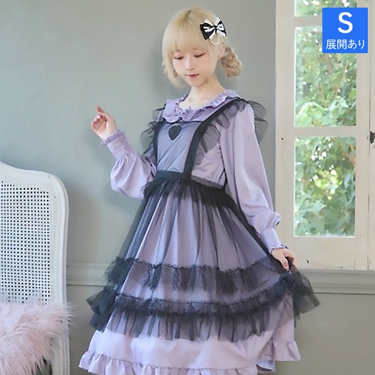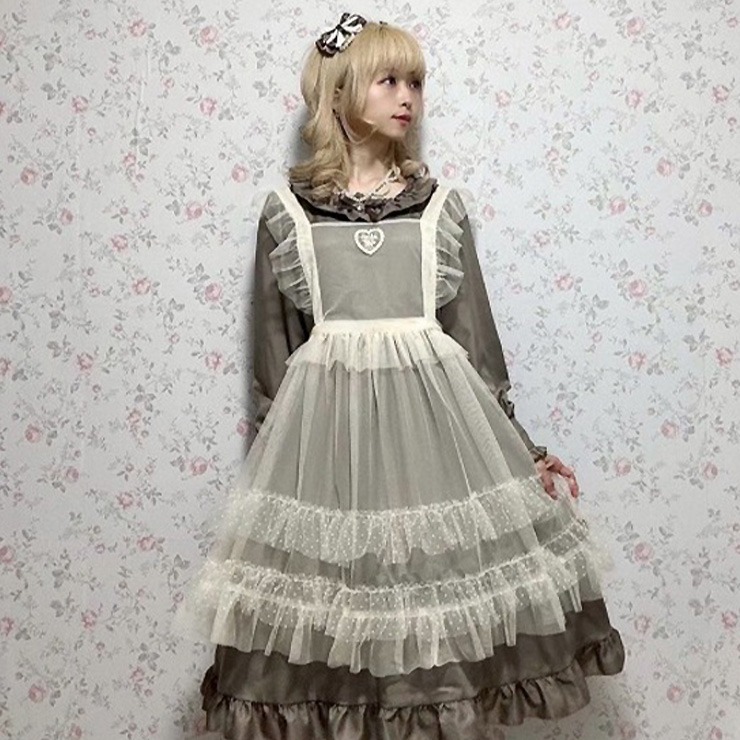 ハートモチーフとたっぷりのフリルが目を引く、ガーリーなエプロンワンピース。