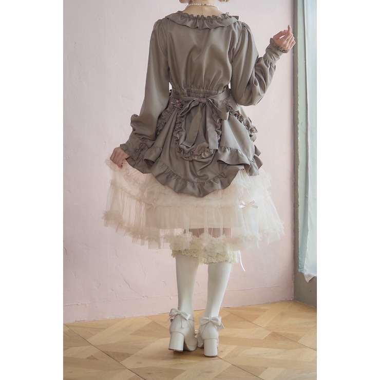 裾のフリル部分はボタンで留めれば、ふんわり立体感のあるバッスル風シルエットに早変わり。