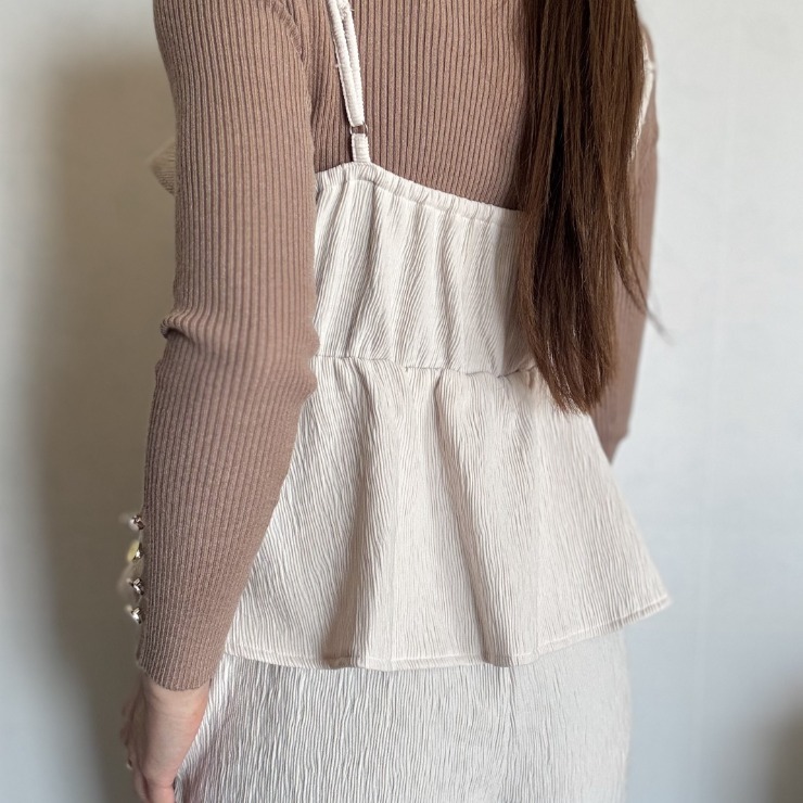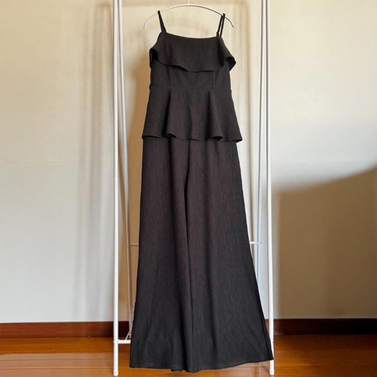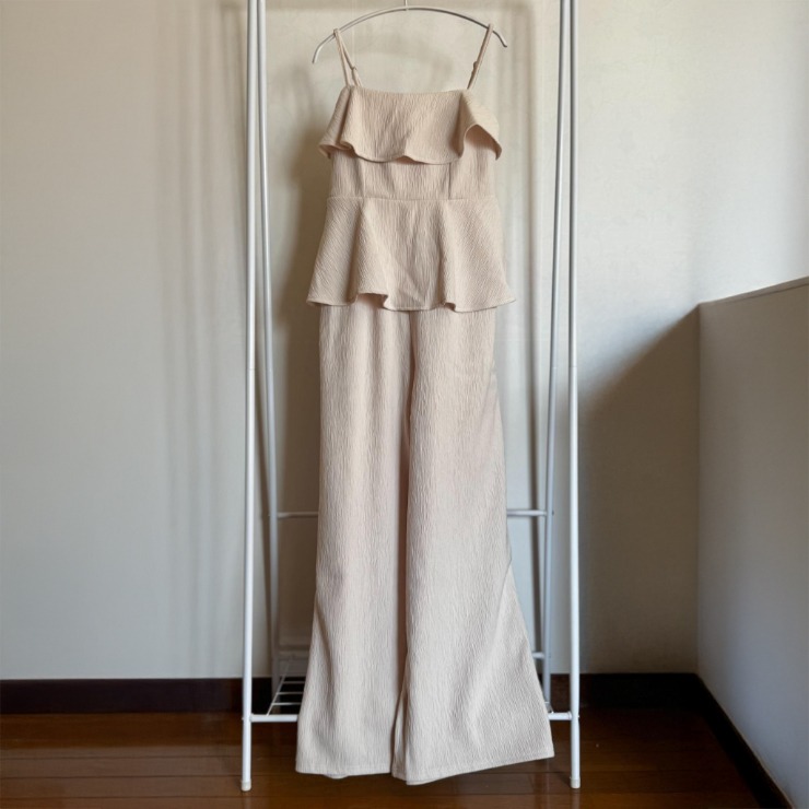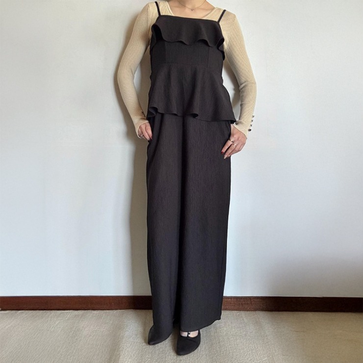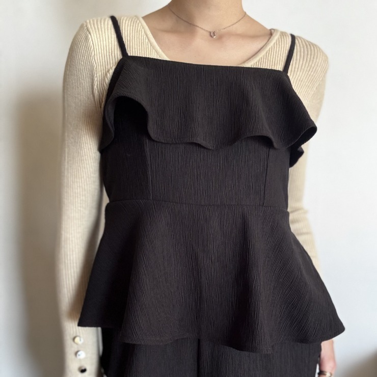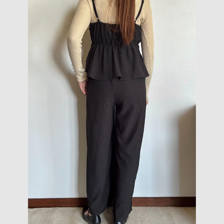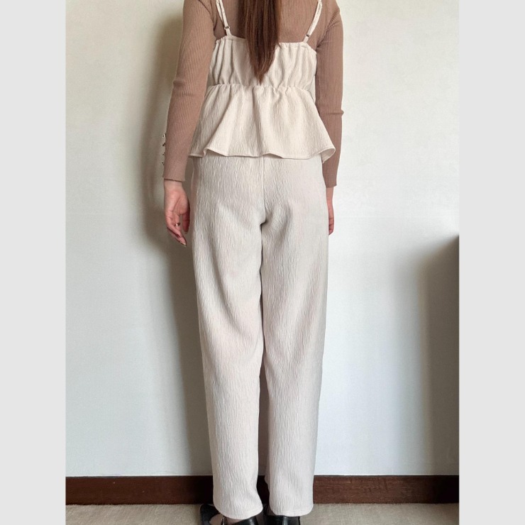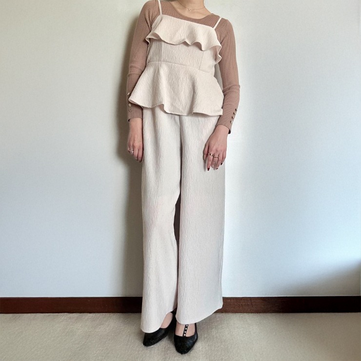 トップはフリル&ペプラムデザインでフェミニンに、ボトムは広がりすぎないワイドパンツでスタイルアップが叶います。